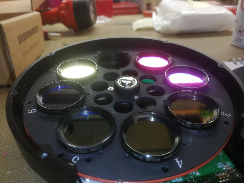 Suite à l'arrêt de l'activité astro, je mets en vente ma roue à filtre ZWO 8x31,75mm avec 7 filtres astronomik en 31.75 montés :