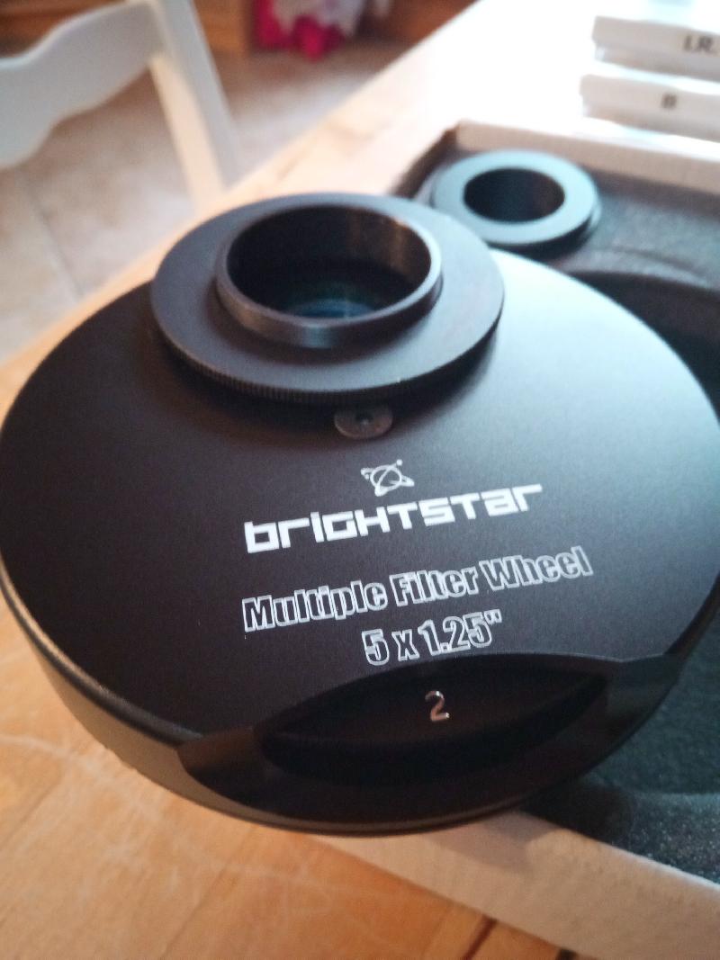 Roue à filtres manuelle 5 emplacements pour filtres 1.25 pouces. Pour photo planétaire avec une petite caméra monochrome.