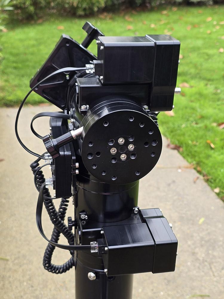 Cette monture azimutale double, élégante et très robuste, est usinée CNC, anodisée noire et équipée de ferrures en acier inoxydable.