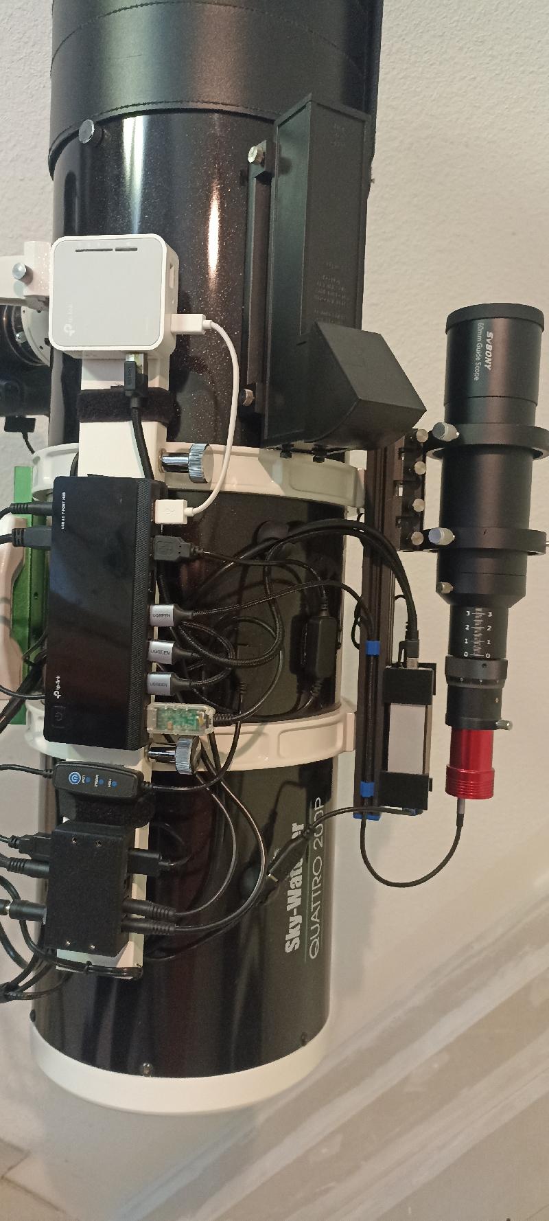 Mon setup à été utilisé quasi essentiellement pour de l'astrophoto (je peux partager de photos sur demandes) mais également pour quelques observations publiques organisées avec mon club astro. J'utilise un Raspberry Pi4 monté directement sur le télescope et un module wifi ce qui me permet de contrôler le télescope et tous les accessoires à distance depuis un PC/Tablette/Téléphone. Il est possible de remplacer le Rpi4 par n'importe qu'elle autre solution ou de relier directement un PC via 1 seul câble grâce au Hub USB. La distribution de l’énergie se fait également via un hub d'alimentation spécifique ce qui permet de n'avoir qu'un seul câble à connecter soit à une batterie soit à un adaptateur secteur. Le tous est pensé pour un montage/démontage rapide puisque tous les câbles restent montés sur le tube.