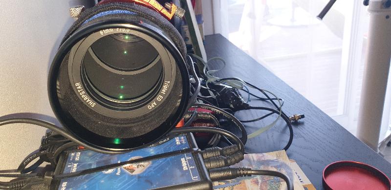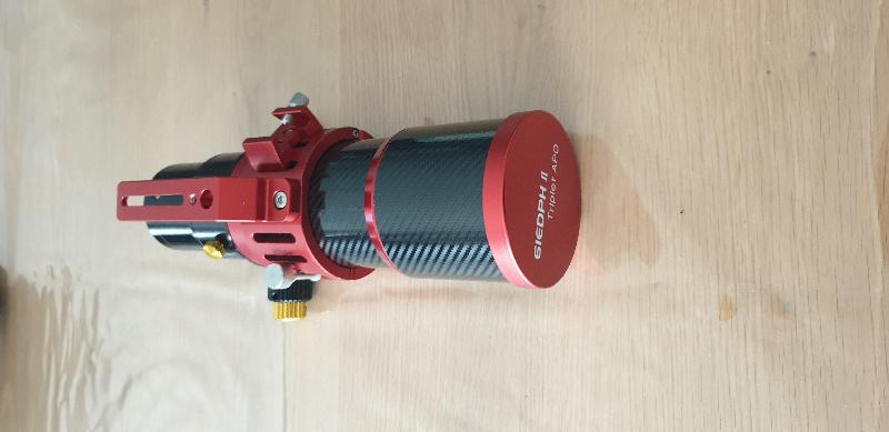 La lunette est complète, avec son collier et sa poignée de transport, ainsi que son réducteur F4.5. Je lui ai mis un cover vinyle style carbone, qui est purement visuel.