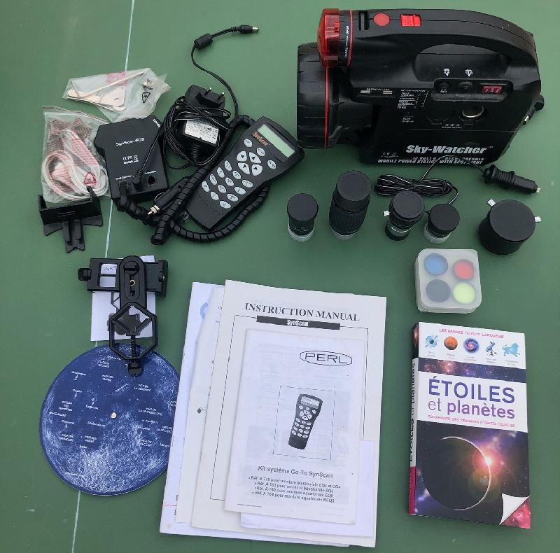 Avec tous ses accessoires d'origine, et accompagné d'optiques additionnels, filtres, d'une monture EQ3, d'un moteur Go-To, et d'une batterie avec spot.
