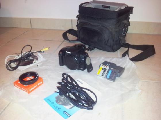 -Canon EOS 350D avec baque T2 sacoche de transport deux batteries chargeur secteur, logiciel CDROM, manuel utilisateu, télécommande à distance Canon, câble vidéo et USB compact flash 128mb. Le tout en parfait état.
