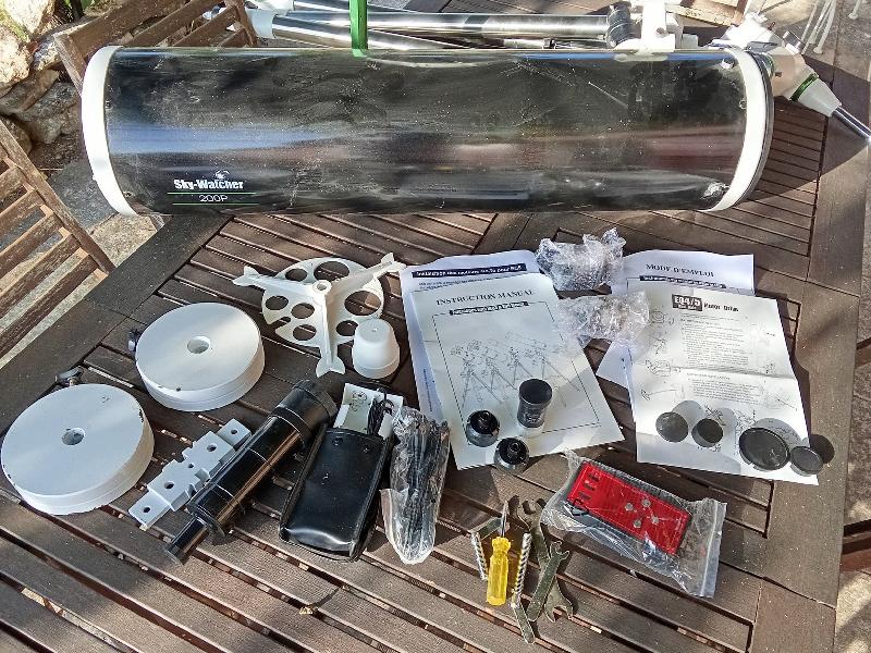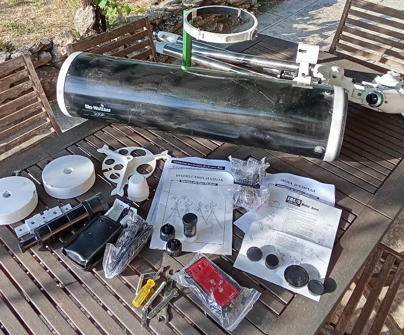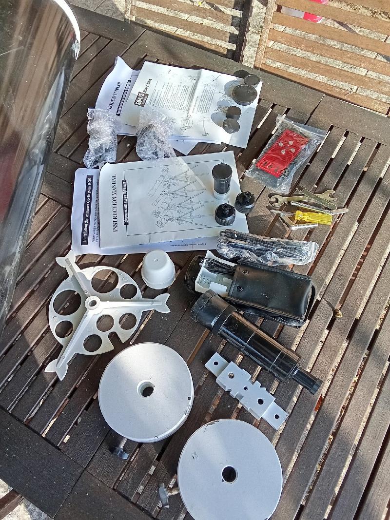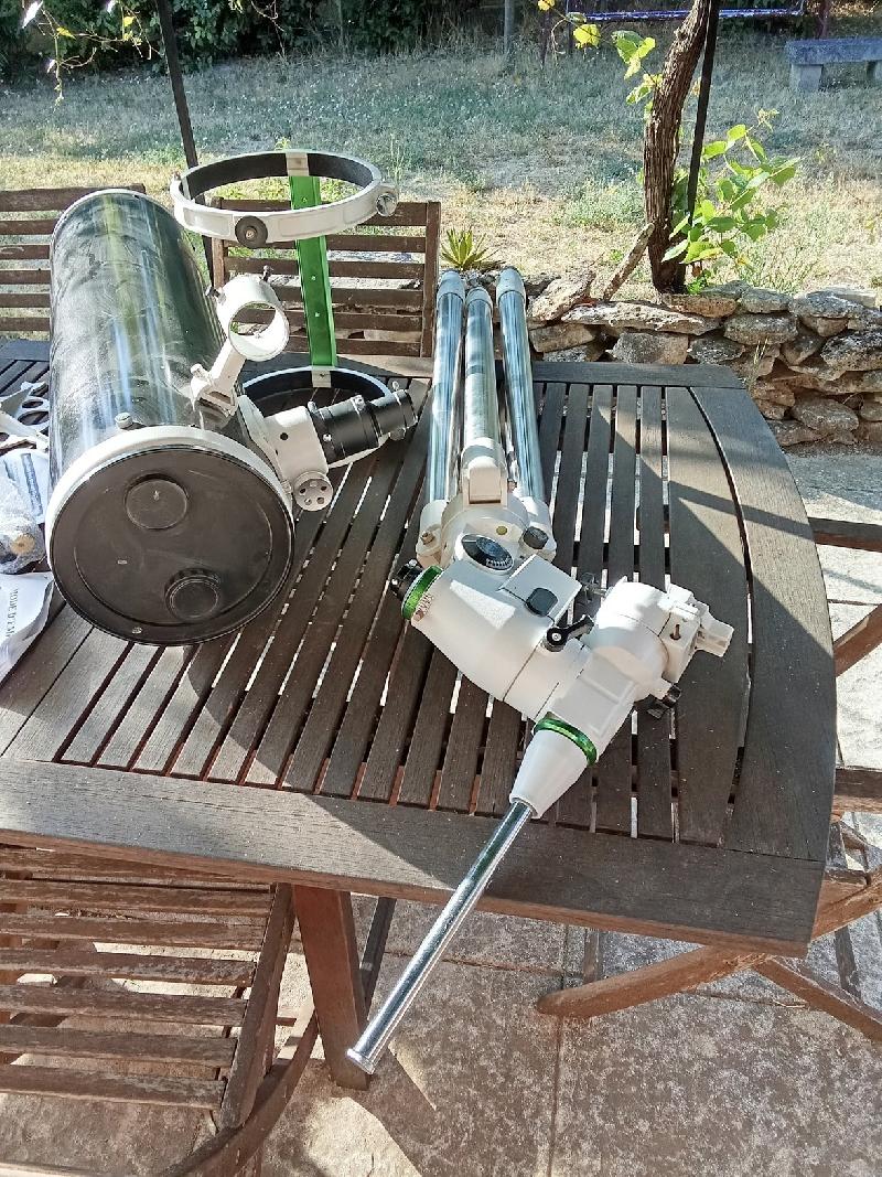 Je vends un setup complet : tube Newton 200/1000. Trépied et monture motorisée EQ5. Tous les accessoires : deux oculaires d'origine, la tige et les contre-poids, les anneaux pour tenir le tube évidemment, alimentation et câble, chercheur d'origine, bref tout ce que vous voyez sur les photos. Je peux signaler deux choses : 1. c'est un télescope qui a pris un peu la poussière mais très très peu sorti. 2.Une chose sûre car j'ai vérifié : le miroir est PARFAIT, propre. Les contrepoids, du fait de leur masse ont été un peu cognés lors de l'entreposage, donc ils ont un ou deux éclats sur la peinture, qui a donné un point de rouille. Je n'ai pas utilisé le matériel moi-même mais c'était un kit complet. Il est encore en vente sur les sites, je crois que ça correspond à : "Télescope N 200/1000 Explorer 200P EQ5" qui vaut 700€. Possibilité d'acheter séparément le tube ou la monture seule. Je pense qu'un envoi est impossible, donc prévoir de se voir vers Cavaillon (84), si vous faites de la route et que vous prenez l'ensemble, je paye l'essence ! Sa vente va permettre de finaliser un autre projet associatif : "un petit télescope à l'hôpital pour enfants malades en longue durée." (Cagnotte Leetchi accessible sur demande)