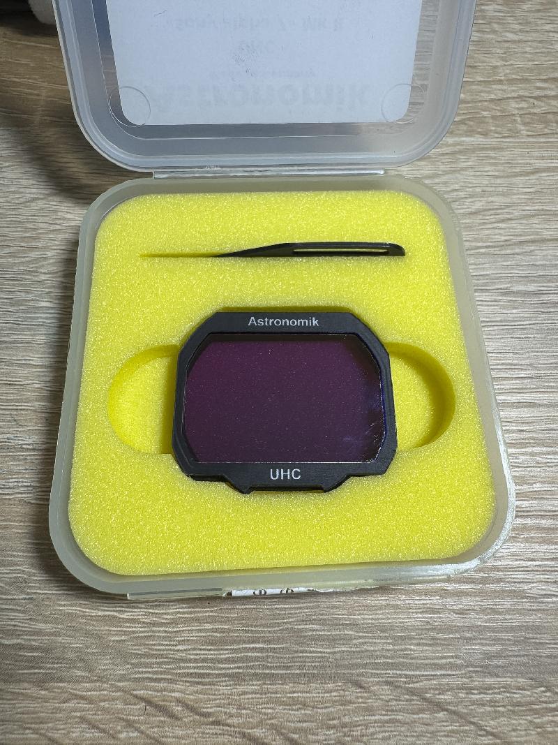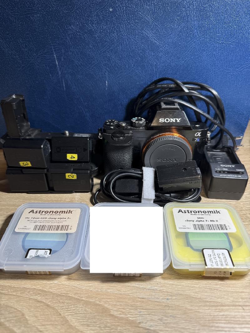 Vendu avec 2 filtres clip-in Astronomik (1x UHC, 1x HAlpha 12nm), un grip, 4 batteries (ne tiennent pas bien la charge, elles sont vieilles), un chargeur et un cable dummy battery principalement utilisé avec une batterie externe pour remplacer les batteries d'origine.