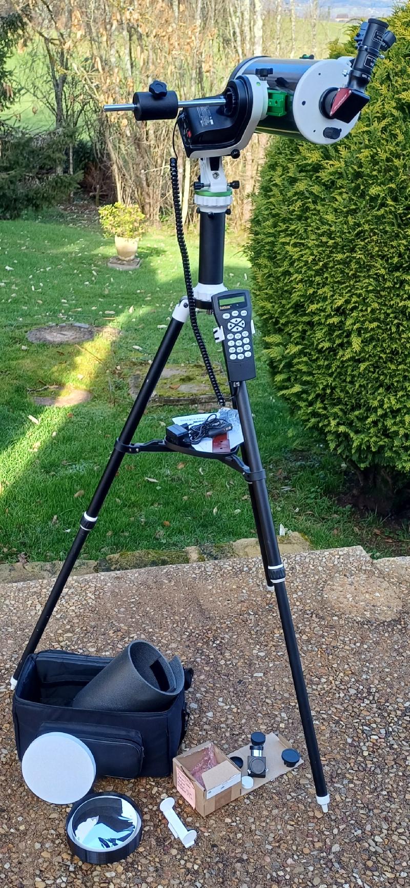 Télescope Skywatcher Maksutov 127 avec accessoires d'origine : Renvoi Coudé, 2 oculaires 10 et 25 mm, une lentille de Barlow x 2, chercheur point rouge,