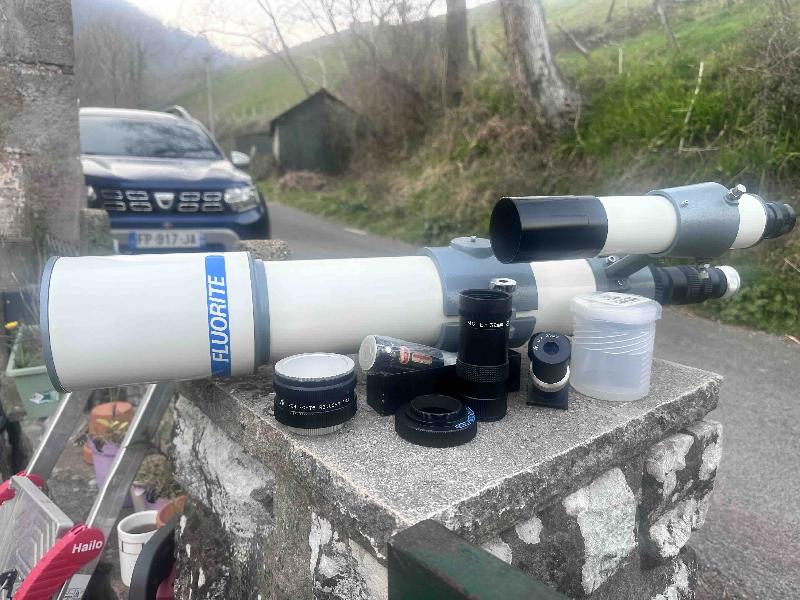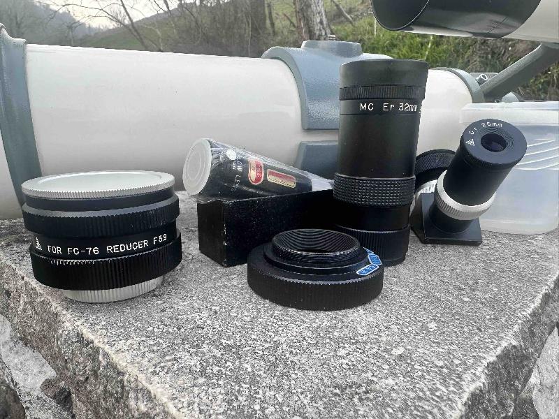 J’ai acheté ce setup en 2018 à un astram puis je l’ai complétée des accessoires Takahashi vendus dans ce lot (plusieurs sont neufs et peu utilisés) : vous avez deux lunettes en une car elle a une sortie en 24,5mm (standard japonais) et une sortie en 31,5mm (standard US) !