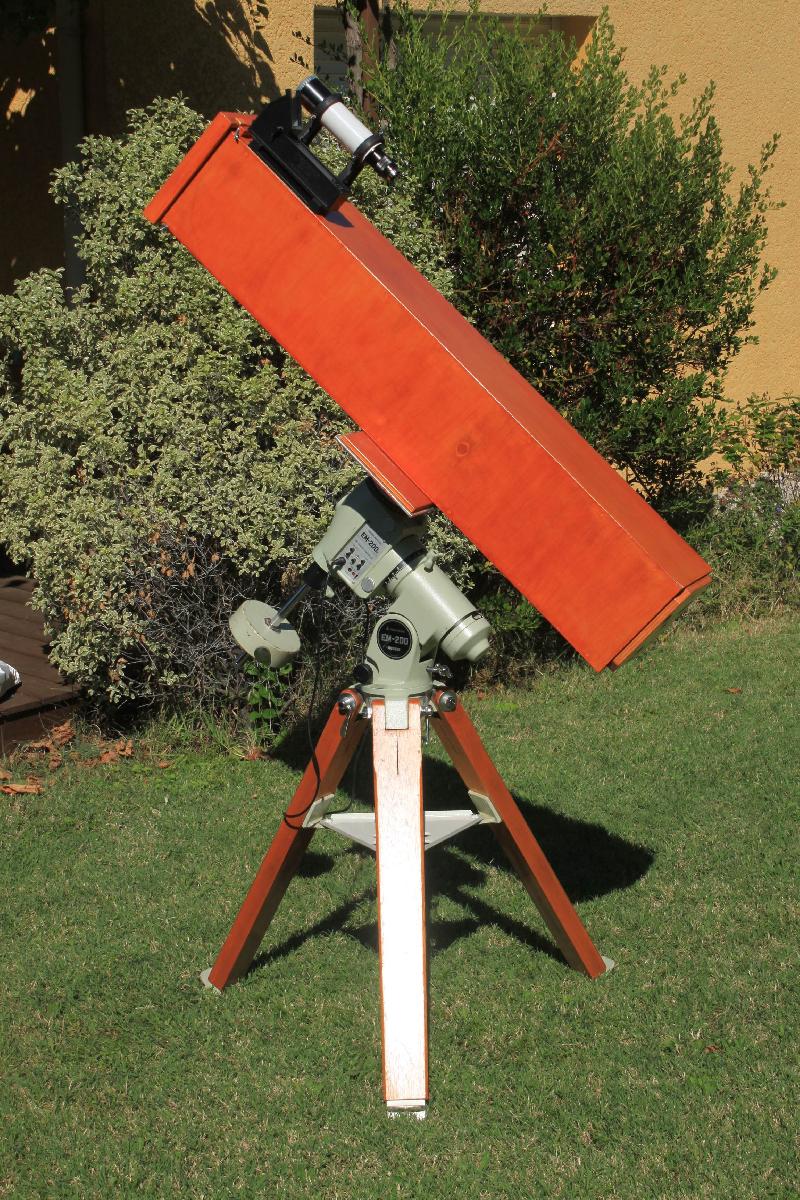 Télescope 155mm, miroir en pyrex taillé par mes soins (d'après le livre de Michel Lyonnet du Moutier), focale environ 1200mm (F/D=7.7). Porte-coulaire diamètre 31.75mm à cabestan au mouvements très doux. Tube en CP vernis marin + peinture noire intérieure. Housse de transport en tissu aluminisé cousu.