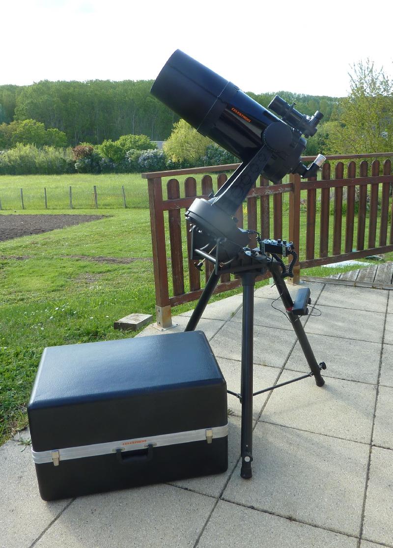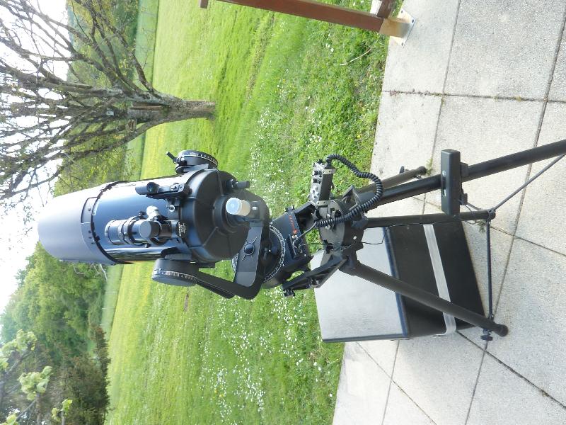 Télescope C8 (Célestron Schmidt Cassegrain), de fabrication californienne, avec son trépied équipé d’une table équatoriale.