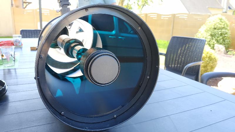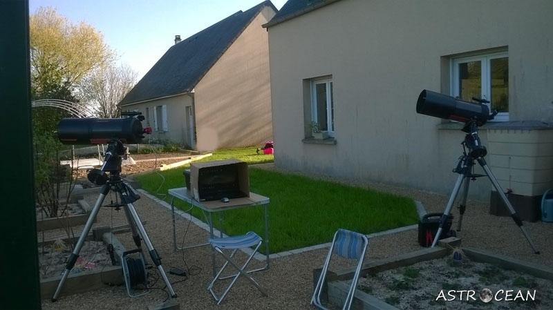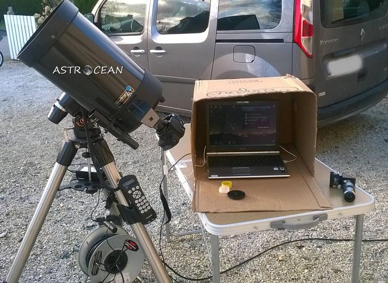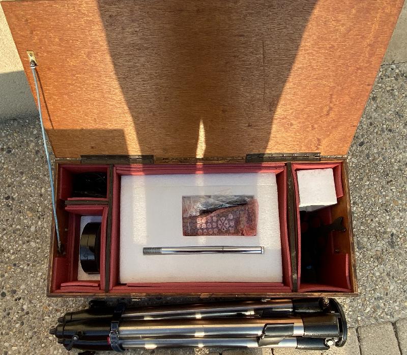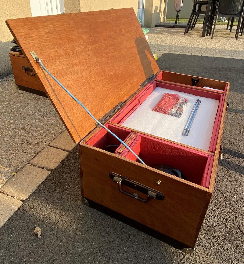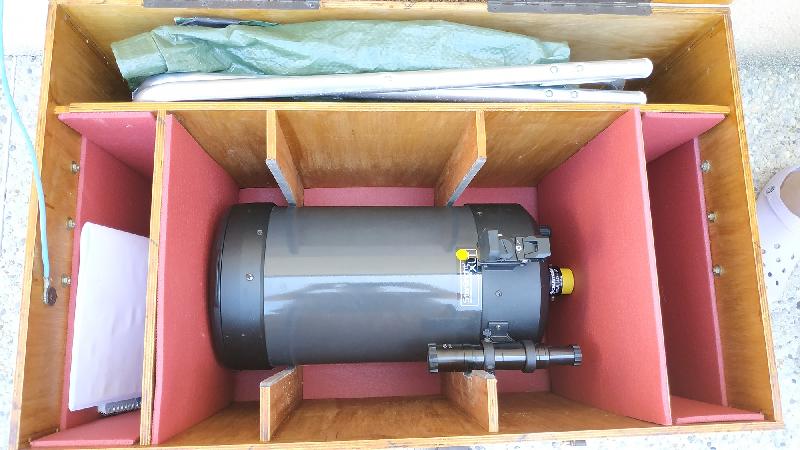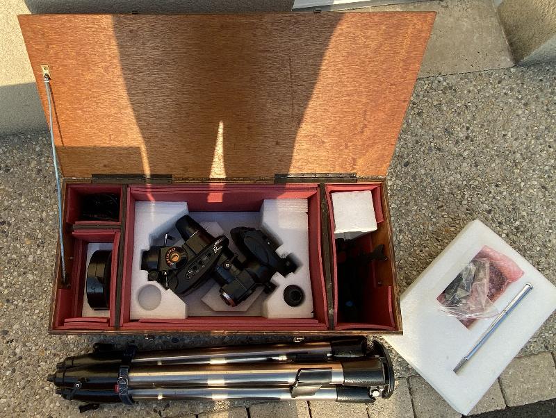 L’ensemble (sauf le trépied) est rangé dans 2 caisses en bois de contreplaqué marine de fabrication personnelle, rembourrée de mousses. La monture se trouve dans sa mousse d’origine. Exemple d’images réalisées avec cet instrument : https://astrocean.home.blog/