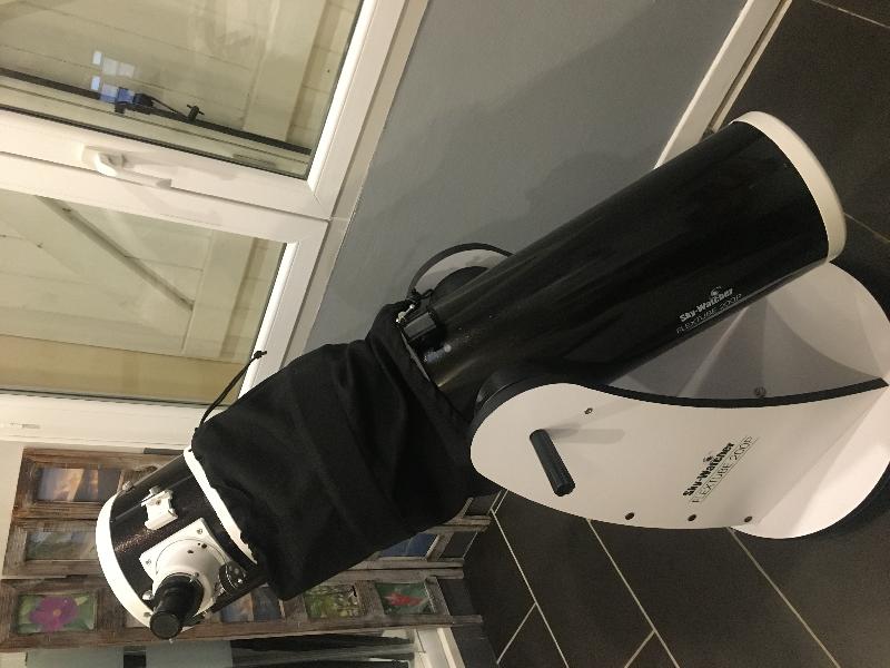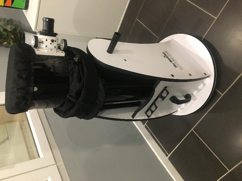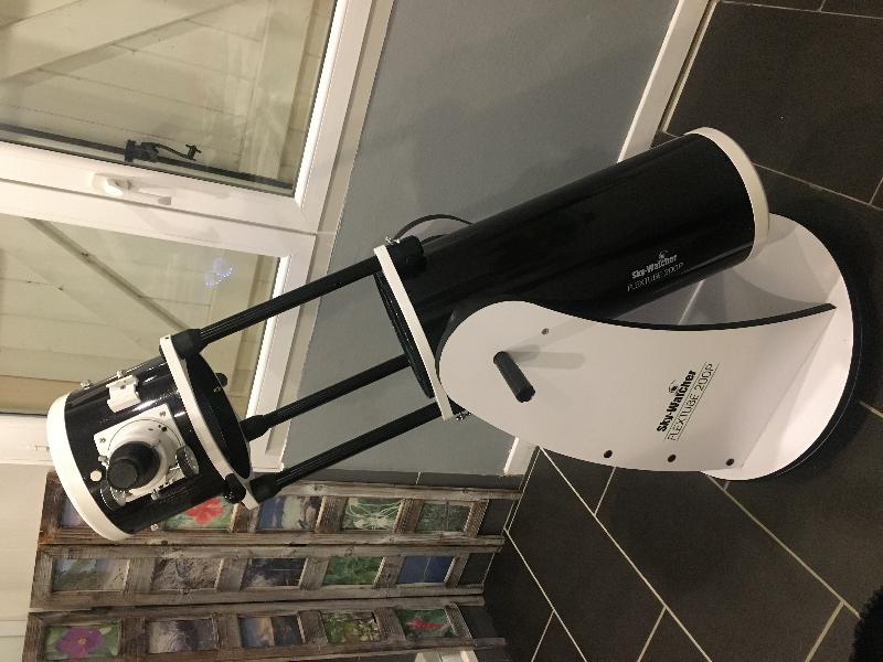 Télescope Dobson Flex Tube Sky-watcher standard ; 200 mm de diamètre, 1200 mm de focale avec jupe incluse. Un oculaire de 10mm et un de 25mm.