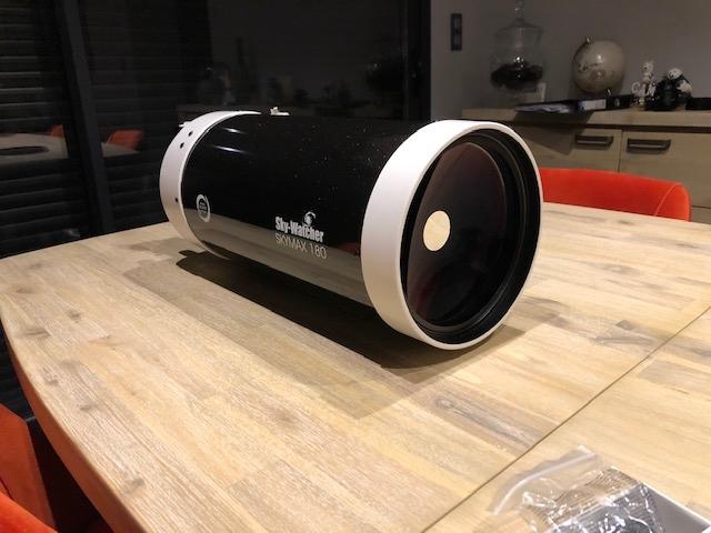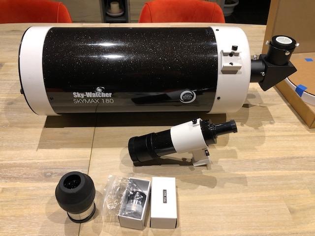 Télescope Maksutov Sky-Watcher 180/2700 avec son chercheur, renvoie coudé, oculaire 28 mm et 10 mm.