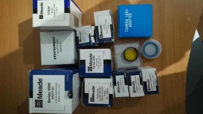 Télescope MEADE LX 90 UHTC / raquette AUTOSTAR / caisse de transport sur roulettes / pare buée / chercheur droit 8x50 / renvoi coudé / oculaires SUPER PLOSSL 6,7mm 26, mm et 40mm / BARLOW x 2 MEADE / filtres colorés vert, bleu, rouge et jaune / filtre anti pollution LP2 T00 bande étroite UHC / tous les accessoires sont dans une mallette de transport.