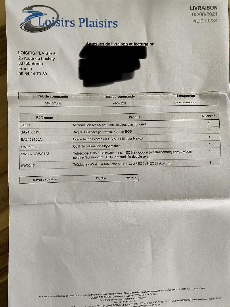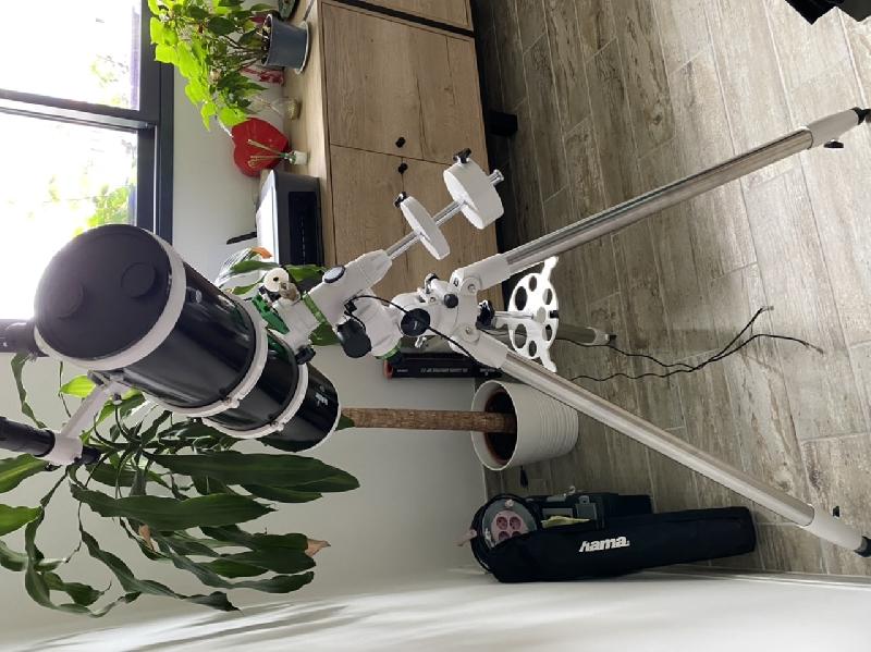 Je vends un télescope de marque Skywatcher en 150/750. Sur monture EQ3-2 motorisé double axe, le trépied d’origine étant trop faible pour de l’astrophoto j’ai acheté un trépied tubulaire beaucoup plus stable.