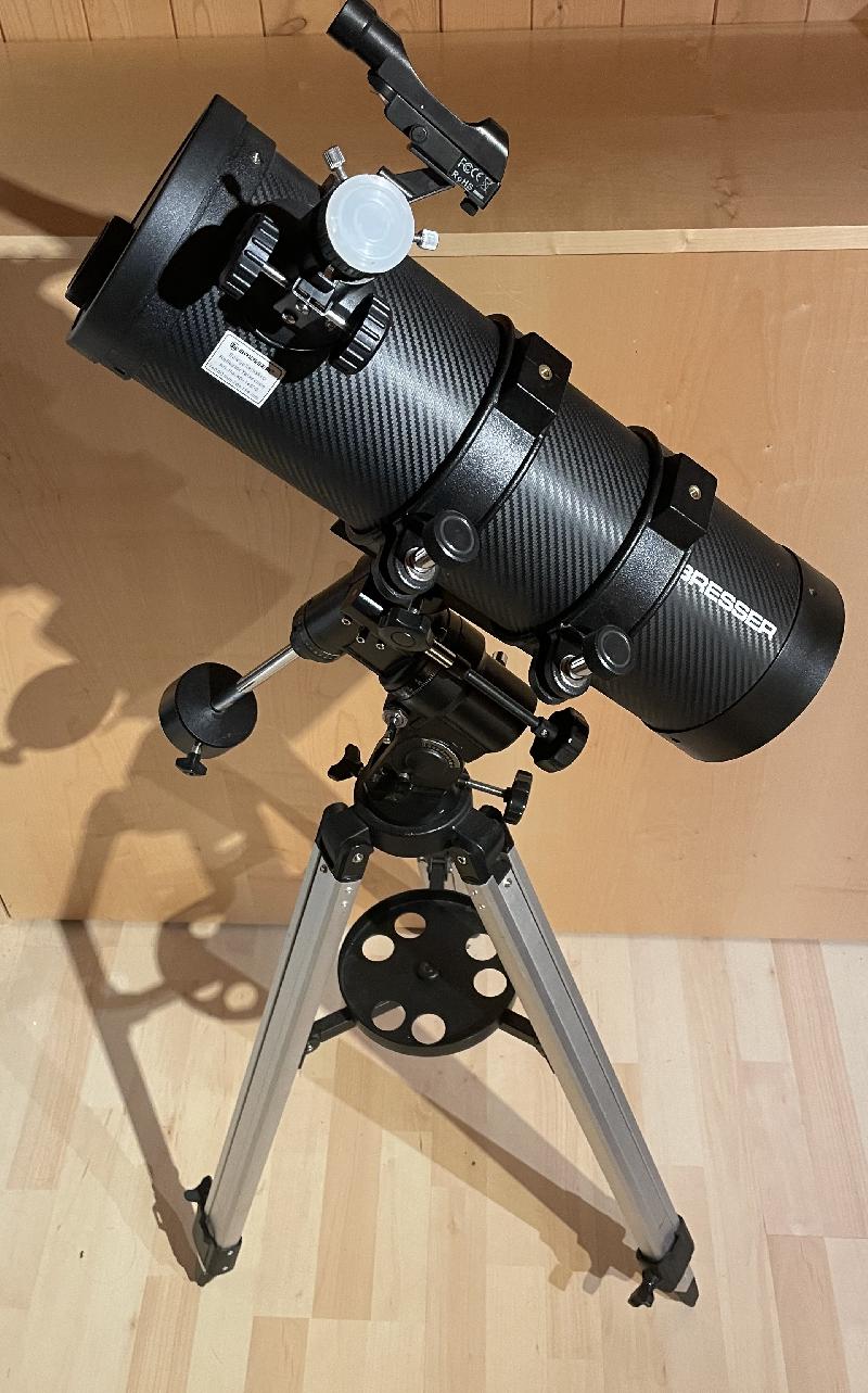 Je vends mon téléscope Bresser Pluto 114/500 EQ3 pour pouvoir me diriger vers du plus gros diamètre. Aujourd'hui on peut l'acheter neuf pour 200-250.-.Je l'ai acheté en 2020 chez Astroshop comme tout premier télescope. Il est assez facile d'utilisation, et on peut assez vite observer la Lune et les planète, même si l'observation des objets du ciel profond se révèle un peu plus compliquée. J'ai très facilement pu observer la lune et même prendre des photos avec mon téléphone. Apres un peu d'entrainement j'ai aussi réussi a distinguer les bandes sur Jupiter et les anneaux sur Saturne. J'ai aussi pointé quelques objets du ciel profond mais ils ne sont pas vraiment distincts.