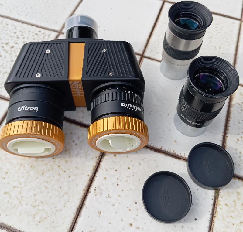 Je vends cette tête binoculaire Omégon en parfait état avec 2 oculaires Orion de25 mm et son coffret. Elle a le gros avantage de fonctionner aussi bien sur les Newton que sur les Schmidt Cassegrain sans barlow ni glasspath. La vision binoculaire est très confortable…