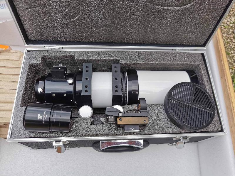 Il s'agit d'une lunette de type Triplet apochromatique de chez TS Optics. C'est une 80/480 soit F6. Elle donne des images ultra nette et sans aucun chromatisme visible. Elle est en très bon état, munie de son pare buée télescopique et de sa mise au point démultipliée 1/10.