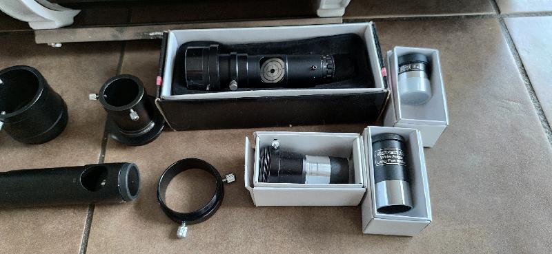 Vends tube SkyWatcher 200/1000 avec correcteur de coma SkyWatcher, 2 oculaires (10mm et 25 mm), Barlow X2, chercheur Skywatcher 50mm, laser de collimation, cheshire de collimation, masque de chanfrein du miroir primaire (Permet d’améliorer la qualité des Etoiles et des aigrettes), filtre solaire fait maison (pas en super état esthétique, mais fait encore bien le taf !, je m’en sers essentiellement pour couper les lumières parasites lors de mes nuits de shoot en le plaçant a l’arrière du tube), masque de Bahtinov, boite a flats maison (fonctionne très bien !!!) nombreuses bagues et raccords …