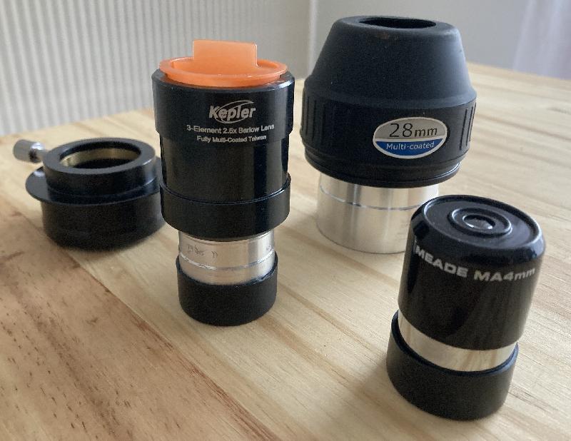 Deux oculaires : focales 28 mm et 4 mm, et une lentille de Barlow KEPLER (x2.5)