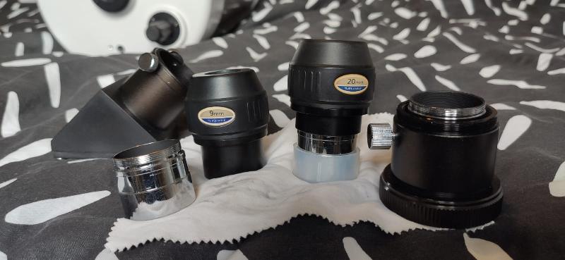Il est vendu avec un renvoi coudé, et deux oculaires 10 et 28 mm (voir photos) qui sont en parfait état.