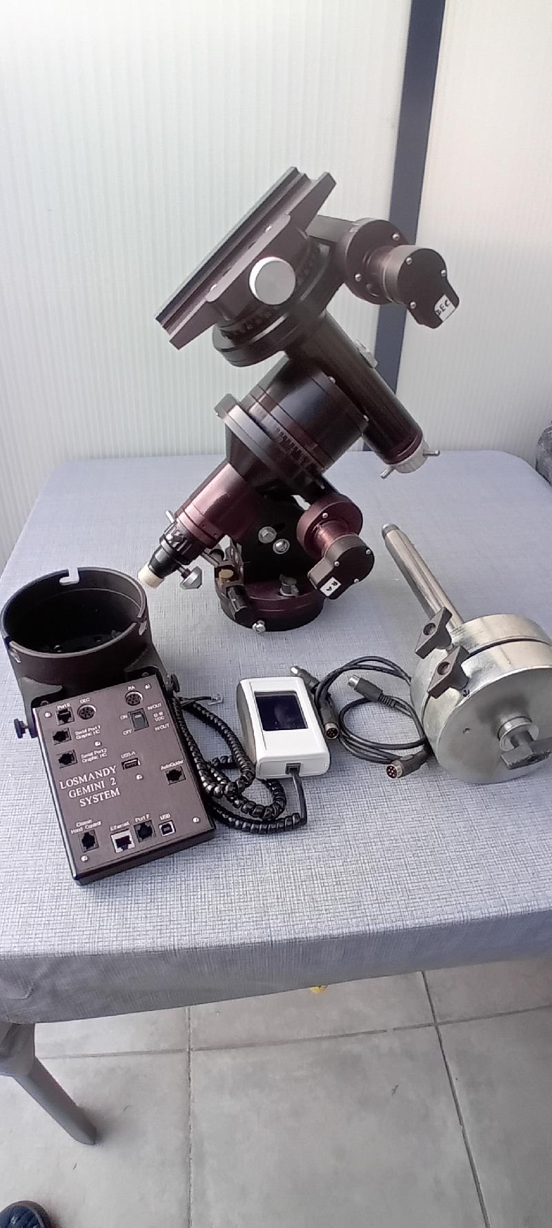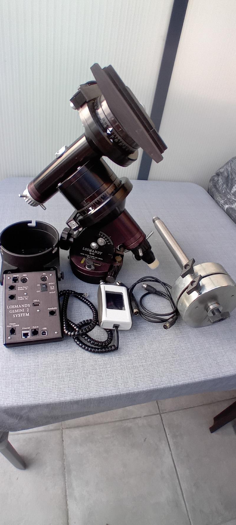 G11 équipé du gémini 2,de deux contrepoids de 5kg chacun, en parfait état équipée de la vis sans fin Optique et vision (très faible erreur périodique),du spacer qui permet un suivi plus long avant le retournement au méridien, les deux embrayages RA et DEC sont équipés d'ergots pour une meilleure préhenssion. La raquette de commande est neuve achetée le mois dernier chez OV ( j'avais abimé l'écran tactile sur l'ancienne).