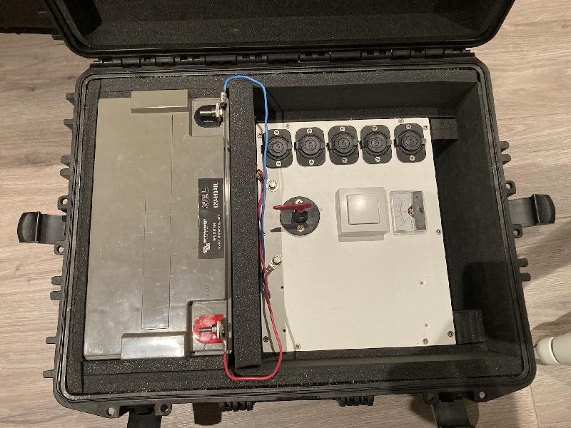 Une valise avec batterie de 110 AH avec interrupteur à clé distribuant du 12V sur 5 allumes-cigares plus un interrupteur connectant un voltmètre. Attention, c'est lourd). Le tout avec trolley (roulettes + poignée sur glissière). 250,00 €