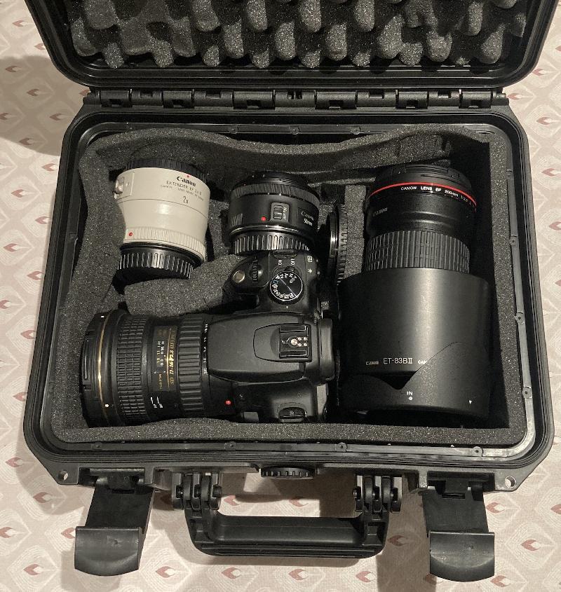 Plusieurs objectifs photo : 200mm // 50 mm // zoom 11-16 mm plus un extendeur de focale Canon.