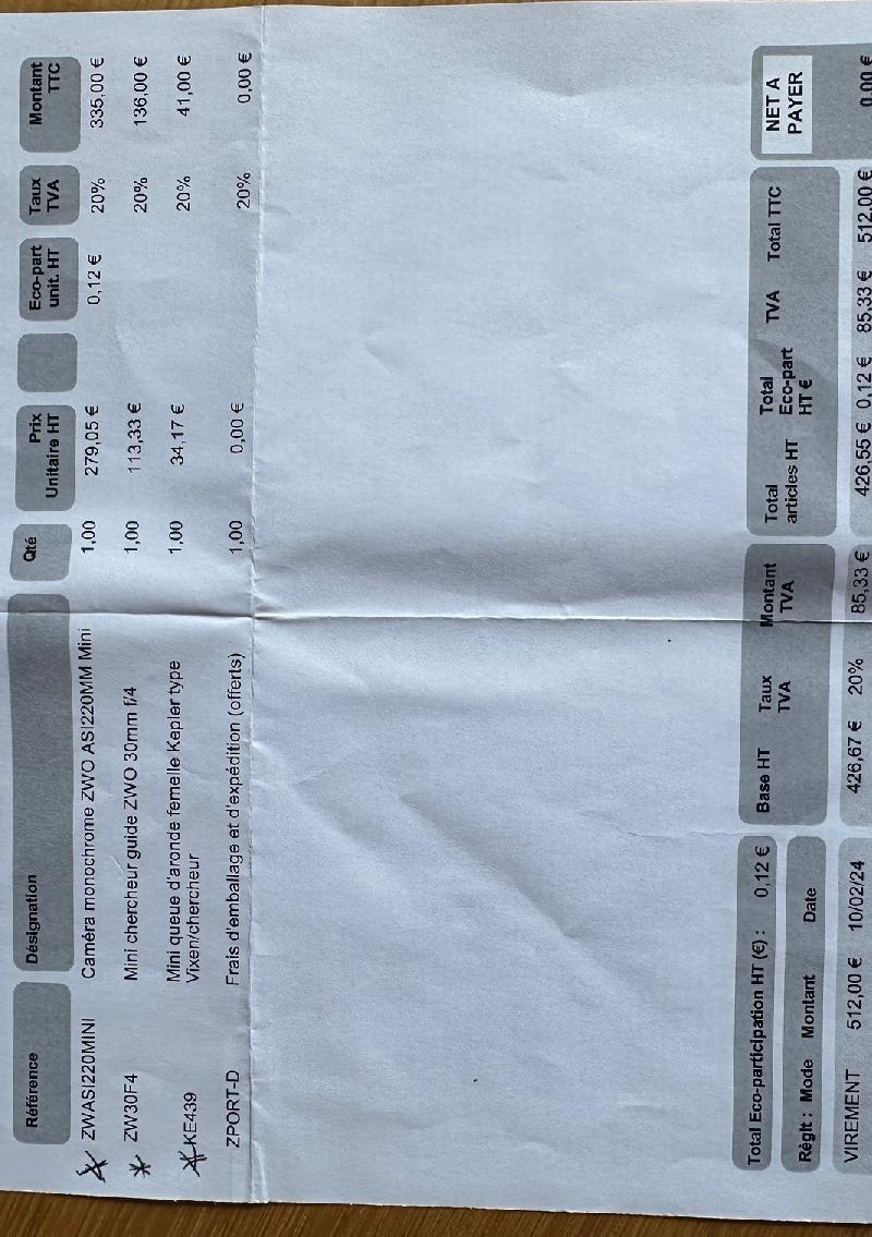 Pour cause de maladie, je vends mon système complet ZWO. Il date de début 2024, n'a jamais été utilisé et n'est jamais allé à l'extérieur ==> Etat Neuf avec tous les accessoires d'origine.