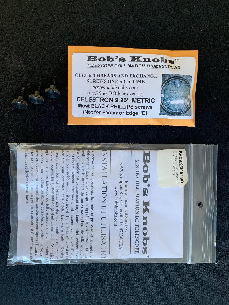 Cause erreur de commande, je vends des vis de collimation Bob's Knobs pour Clestron C9.25 dont les vis d'origine ont un pas métrique. Non compatible avec les modèles Fastar et Edge HD.
