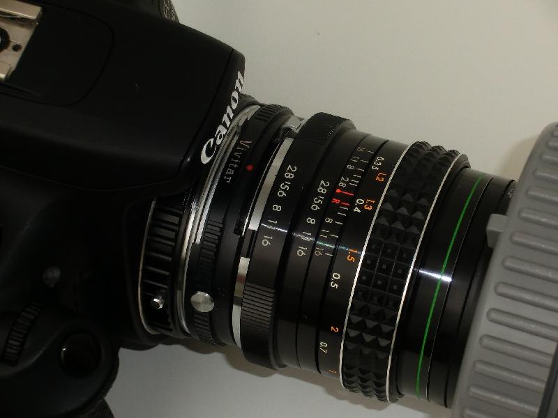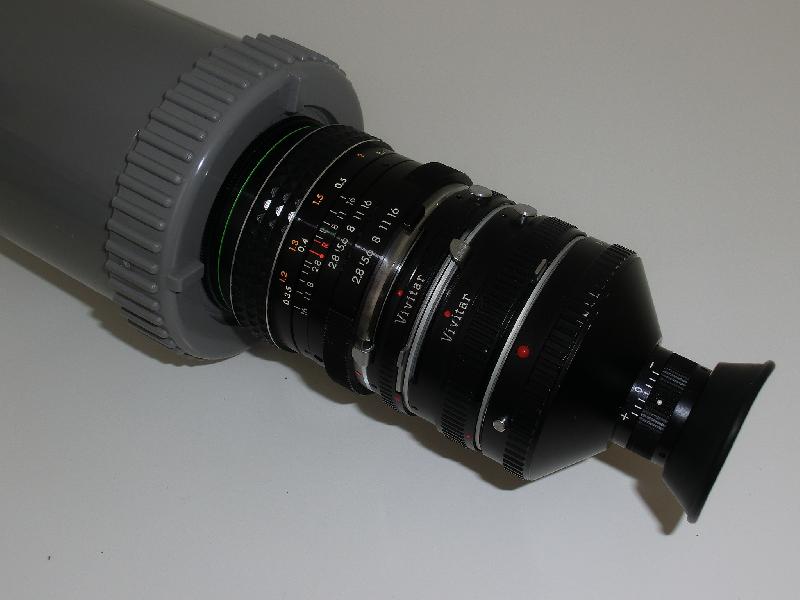 Il est également vendu avec un Rexagon 28mm f/2.8 comme "oculaire", en monture Minolta MD. Positionné à la bonne distance, il permet une bonne couverture de l'écran arrière du tube intensificateur (voir la photo verte).