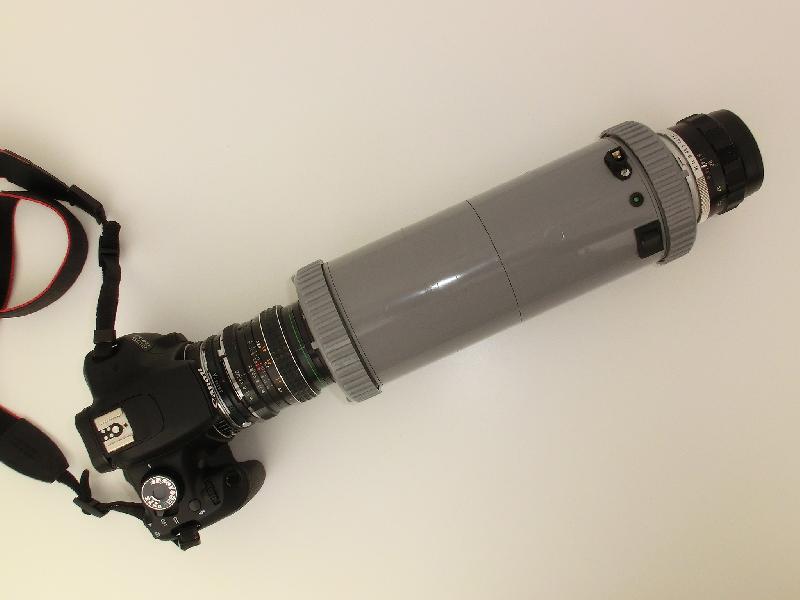 Derrière on peut mettre au choix un monoculaire Minolta (fourni), ou bien un appareil photo. Les adaptateurs fournis permettent de monter un reflex APS-C Canon avec un champ quasi optimal.