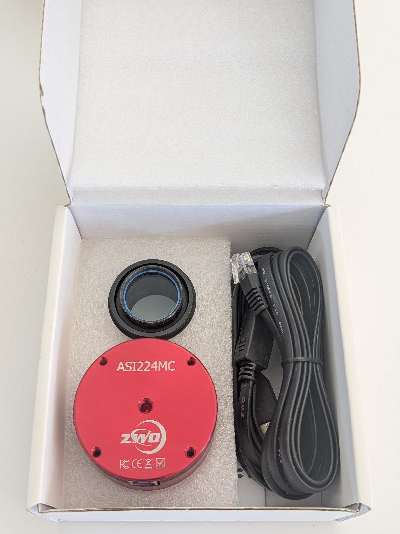 Asi 224mc, réputée pour l'imagerie planétaire. Utilisable également en All-sky pour votre observatoire. Inclus en plus du coffret complet, un filtre anti-IR.