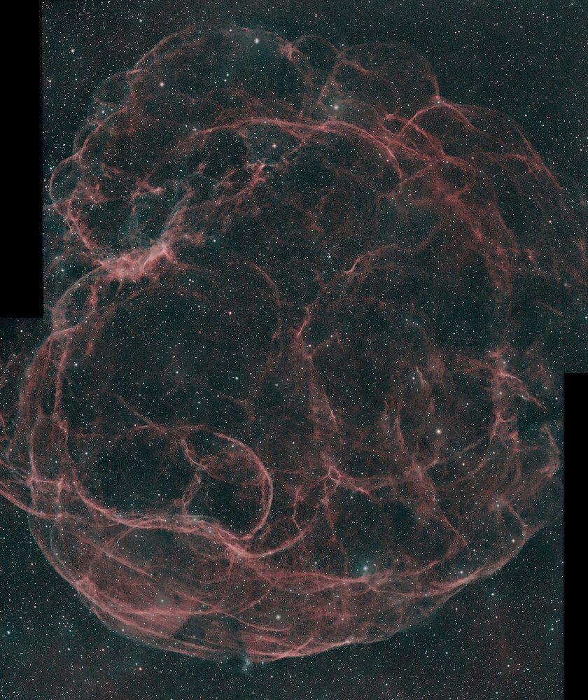 Bonsoir à tous, Voici le résultat de 3 nuits d'acquisition sur Sh2-240 ou la nébuleuse Spaghetti. C'est une mosaïque de 2 tuiles qui en aurait mérité 3 mais j'ai préféré privilégier le temps de pose car j'ai manqué de nuits dégagées. Vraiment pas évident le traitement, j'ai fait pas mal d'essai et voici ce que j'ai obtenu de mieux. Et ça ne donne pas la même chose d'un écran à l'autre (plus claire, plus sombre, etc ...) Ma caméra était mal orientée c'est pourquoi il y a un décalage entre les 2 tuiles, dommage moi qui pensais être comme il faut en gardant la même AD et en changeant juste la déclinaison, ben c'est raté 😄 Setup TS80 (80/480) + Reducteur 0.79 + ASI294Mc Pro + filtre Idas NB1 sur EQG Goto Guidage lunette ORION 80/400 + DMK41 Acquisition NINA Traitement Siril + Gimp Extraction Ha Oiii Composition LRGB et réduction d'étoiles Prise de vue le 7 et 8/02 + le 14/02 si je me souviens bien 1ère nuit : 6h30 sur la 1ère tuile 2ème nuit : 6h30 sur la 2ème tuile 3ème nuit : 3h sur chaque tuile Soit un total de 9h30 sur chaque tuile Et plus de nuits dégagées pour poursuivre et maintenant que la lune qui pointe son nez, c'est fini pour cette année je pense. A+ Manuel.