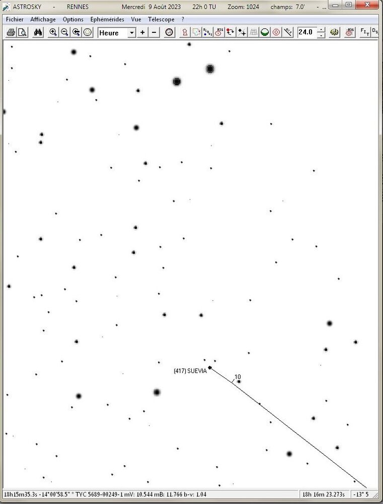 Il semble que ce soit un caillou de 41 km de diamètre répondant au doux nom de Suevia, 417 de son petit nom Et c'est le fait qu'il soit encadré par une étoile double d'un coté et d'une autre étoile un peu plus brillante de l'autre qui donne sa forme bizarre à la trace.