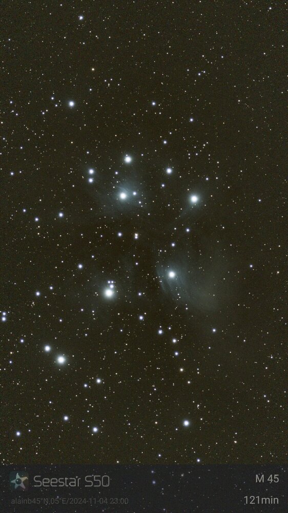 M45 seestar faite le meme jour que m31 ci dessus pas de traitement uniquement l'empilement auto