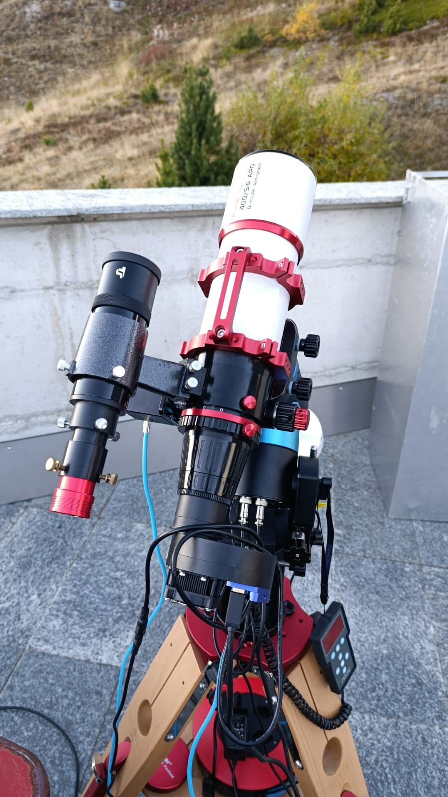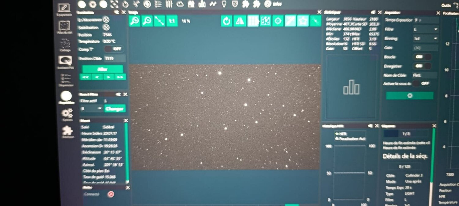 Hello, alors un premier retour : visiblement, faut bien faire les connexions dans l'ordre. L'autre jour, quand j'ai testé en intérieur, tout bien. J'ai sorti le matos samedi dernier : je n'ai rien réussi à faire. J'ai rien pu connecter. J'ai donc refait des tests en intérieur et j'ai de nouveau réussi. Cet après-midi, j'ai tout mis dehors, j'ai fait des essais de jour, pour voir un peu, faire les connexions, tout ça tout ça. J'ai réussi de nouveau. Donc là, j'attends la nuit pour faire des tests sur le ciel, notamment pour le plate solve. C'est la partie qui m'intéresse le plus. Et plus tard, je vais regarder pour une utilisation avec NINA, voir ce qu'on peut faire aussi. Donc à très vite pour de nouvelles aventures -