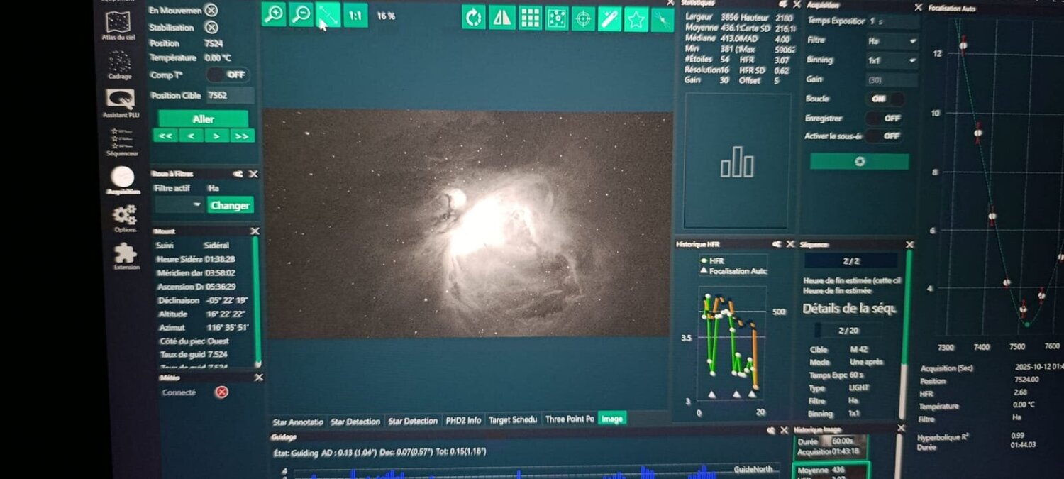 Bonsoir tout le monde, comment ça va t'y donc? Il y avait bien longtemps que je n'avais pas fait d'imagerie et le matériel prenait trop la poussière. Donc, hier, j'ai sorti le petit setup de poche (grosse poche). Il s'agit d'un trépied Geoptik Hercules, une Pegasus NYX 101, une askar 400 en test (et bientôt à moi), une QHY minicam 8 noir et blanc. Le but : me former sur NINA et apprendre à automatiser avec le séquenceur simple pour le moment. La soirée avait mal commencé car je n'avais pas installé les fichiers d'astrométrie (persuadé que oui, mais c'était sur d'autres PC, pas sur mon Mele Quieter 4C que j'ai bricolé avec les conseils de la chaine Cuiv the Lazy Geek pour en faire un hotspot, et ça fonctionne super bien) Hier, c'était un peu la découverte avec réglage du moteur de focalisation (un pégasus aussi, qu'il va falloir que je fixe autrement pour que ça ne touche pas la monture pendant les pointage, là, c'est très limite par moment au niveau du câble USB), test de la résolution astrométrique, du séquençage des objets, de l'autofocus, ... J'ai fait du facile parce que ça donne du courage quand on fait un truc facile. C'est pour ça que j'ai fait M42 en fin de nuit de test. Du Ha, 60s en unitaire. J'ai fait 100 poses. Et voici donc un résultat rapide de traitement fait ce soir pour avoir une première idée. Et en ce moment, le setup est lancé pour la nuit en autonomie complète. On verra demain si ça aura bien fonctionné. 3 objets programmés sur toute la nuit. Dont M42 pour tenter d'avoir la couleur. Bref, ça commence à se préciser, l'étape suivante ce sera le séquenceur avancé, mais comme je ne suis pas en poste fixe, c'est moins urgent. Il faudra surtout que je fasse les préparatifs pour sortir l'AP900 avec le 300 et la player One. Depuis le temps que j'ai tout ça qui dort aussi, on va faire changer tout ça. Et pourquoi pas la QHY sur le 300 f4 (miroir Skyvision que j'ai eu d'occasion, mais encore jamais pu tester :/) Alors? Des choses à dire? ça vous plaît? Une bonne soirée tout le monde. Michaël