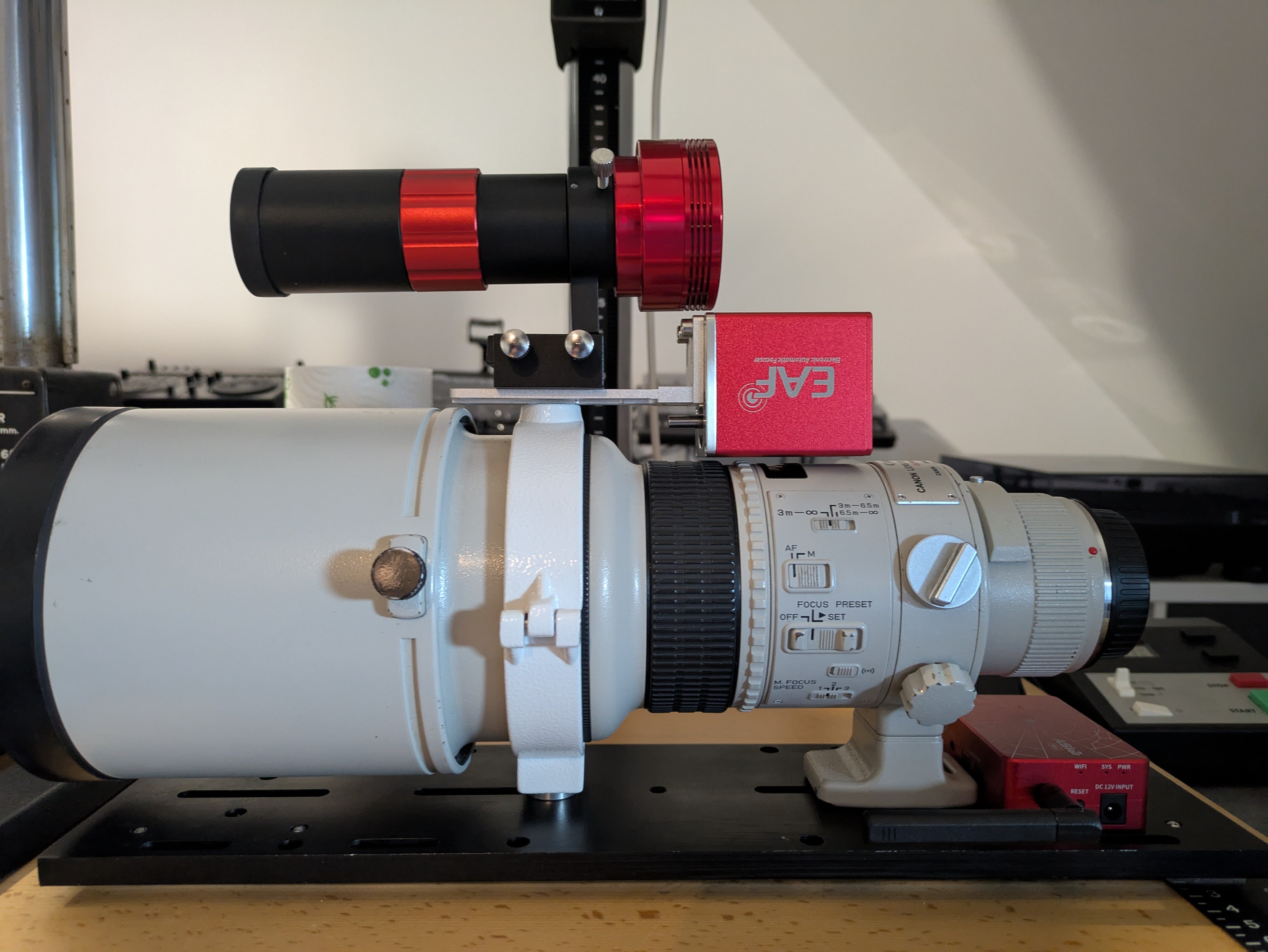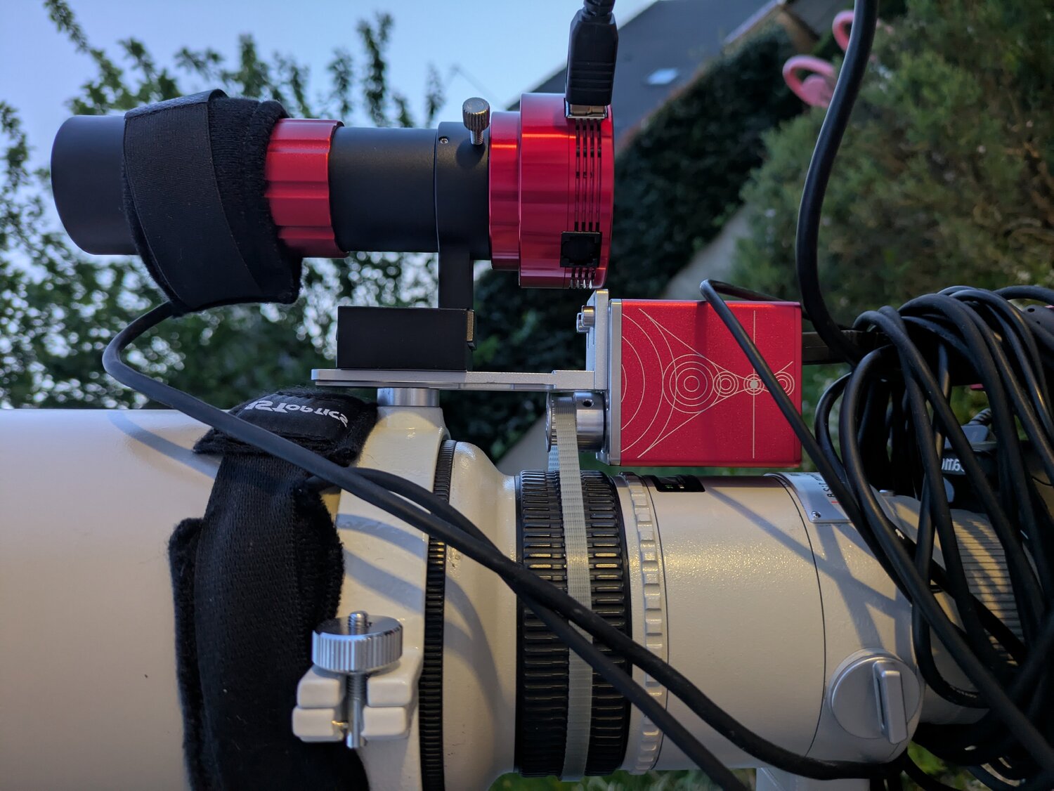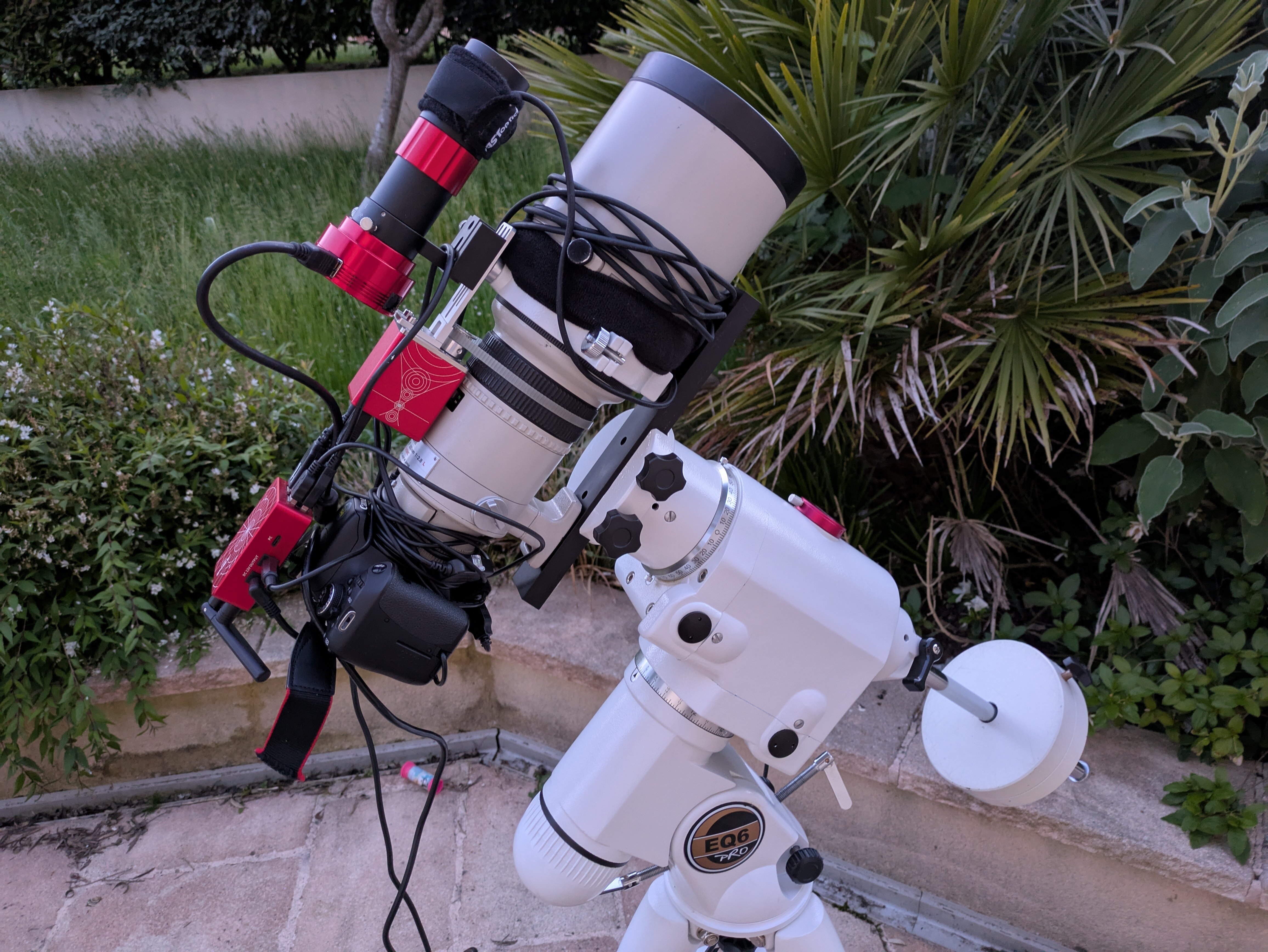 Salut à tous, Bidouillage déjà effectué avec grand succès : Un ancien 300 f2.8. Il faut trouver la bonne longueur de courroie et le bon collier pour avoir suffisamment de rigidité. J'ai dû insérer des rondelles épaisses pour rattraper l'écart de hauteur entre le collier Canon et le collier Skywatcher que j'ai acheté exprès. -