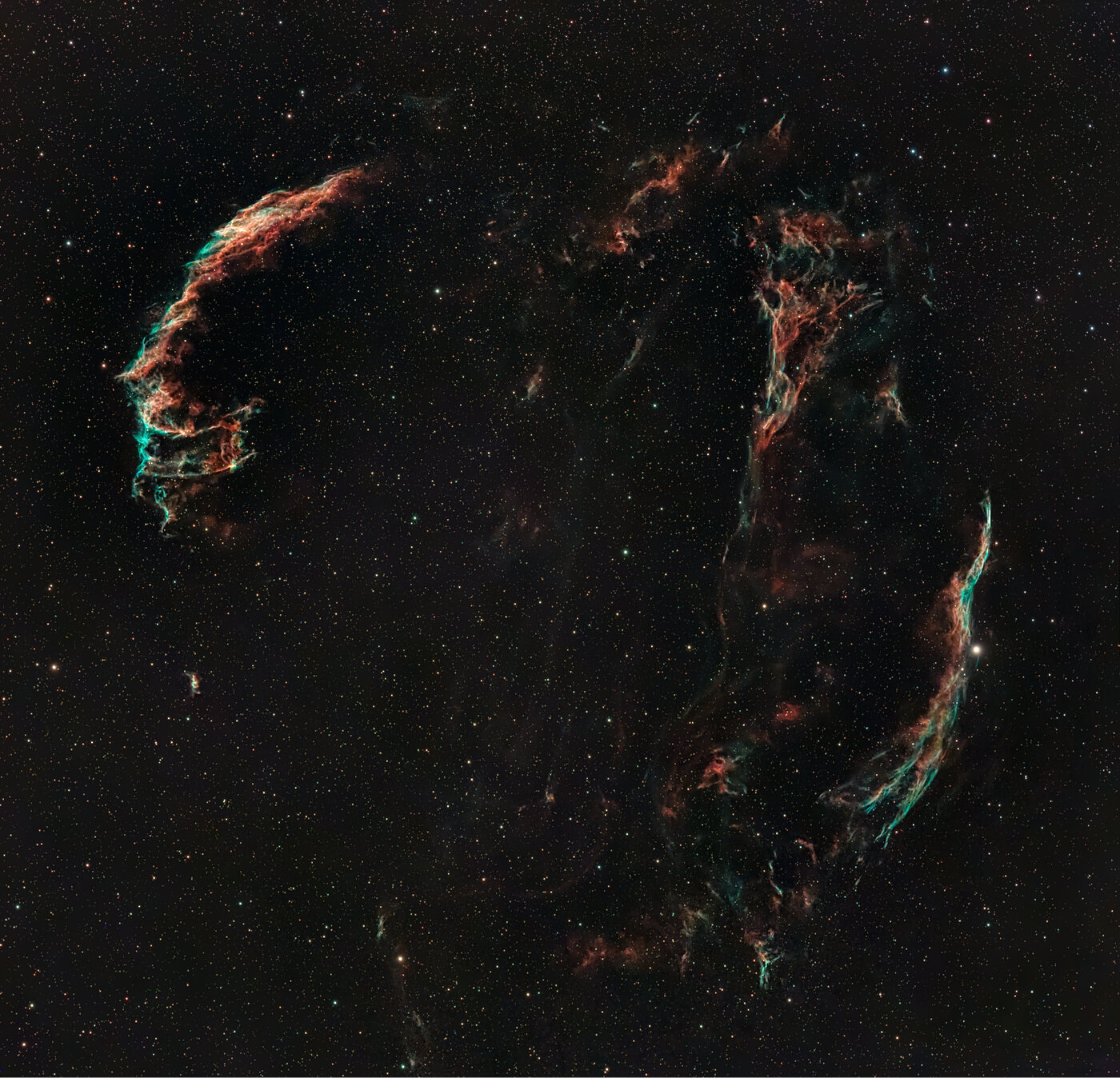 Hello 🙂 Le 25 août 2025, les Dentelles du Cygne capturées avec le Vespera Pro. Paramètres d'acquisition: - mode multi-nuit: les 24 et 25 août 2025 - mode mosaïque automatique - 1145 trames empilées en 06h21m de temps de pose cumulé - utilisation d'un filtre interférentiel DualBand, la nébuleuse émettant dans les fréquences de l'hydrogène (rouge) et dans l'oxygène (bleu), celles-ci passent bien ce filtre. Les Dentelles du Cygne forment un rémanent de supernova dont l'explosion remonterait à une dizaine de milliers d'années. Elles se situent dans la constellation du Cygne. Cette nébuleuse est composée de réseaux complexes de filaments d’oxygène (zones bleutée) et d’hydrogène (zones rougeâtres). - La Grande Dentelle, la partie la plus brillante, se situe dans la région nord-ouest. Elle a la forme d'une virgule composée de filaments très fins s'étendant sur 1,2° suivant un axe NE-SO pour une largeur de l'ordre de dix minutes d'arc. Elle a été répertoriée par John Dreyer sous les désignations NGC 6992 (partie longiligne du nord-est), NGC 6995 (redressement au sud-ouest) et IC 1340 (extensions plus faibles de ce redressement) - La Petite Dentelle se situe à l'opposé de la grande, à 2,5° au sud-est de cette dernière. Elle présente la particularité d'effleurer visuellement une étoile visible à l'œil de magnitude 4.2 (52 Cygni). An nord de cette étoile, la Petite Dentelle est constituée d'un filament comprenant deux brins principaux, s'étendant sur quasiment un demi-degré pour une largeur ne dépassant pas quatre minutes d'arc. A gauche de l'étoile 52 Cygni, le filament s'évase en direction du sud-ouest en trois brins principaux (plus brillants au fur et à mesure que l'on s'éloigne vers l'est). Cette partie des Dentelles du Cygne est connue sous la désignation de NGC 6960. - Le Triangle de Pickering se trouve quant à lui dans la partie nord-ouest de la nébuleuse. Il s'agit d'un triangle filamenteux allongé en direction du sud sur environ 45 minutes d'arc. Le Triangle de Pickering se prolonge par un long filament de plus de deux degrés de long. Caractéristiques des dentelles du Cygne: - dimension angulaire: 230' × 160' - distance: environ 2400 années-lumière -