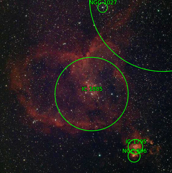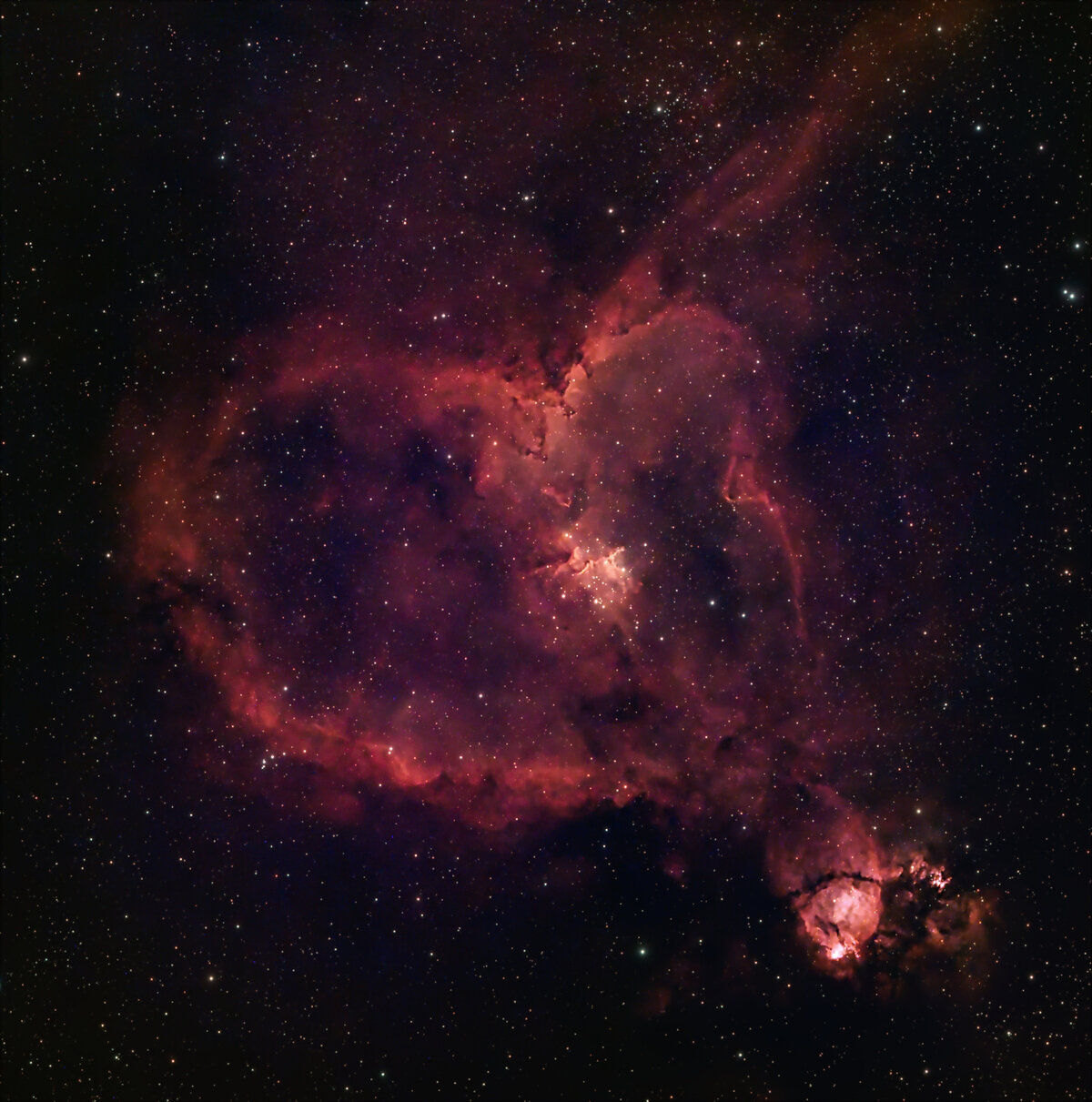 Hello 🙂 Acquisitions: Vespera Pro - mode multi nuits (CovalENS): nuits des 31 août 2025 et 18 septembre 2025 - utilisation d'un filtre interférentiel Dual Band (Oxygène et Hydrogène) - mosaïque automatique de 3.3° x 3.1° - 2094 images empilées en 05h49m00s - poses unitaires de 10s à 20dB IC 1805 ou nébuleuse du Cœur (Heart Nebula) est une nébuleuse en émission, une région HII, et un amas ouvert, située dans la constellation de Cassiopée, dans le bras de Persée de la Voie lactée, notre galaxie. Sa partie la plus lumineuse (NGC 896) a été découverte en 1787 par l'astronome William Herschel. L'amas stellaire ouvert Melotte 15 (de quelques centaines d’étoiles) est à l'origine et au cœur de cette bulle de vent stellaire en forme de cœur. La nébuleuse de la tête de poisson (IC 1795) se situe dans le prolongement de la pointe inférieure de sa forme de cœur. Caractéristiques: - Distance: 6 500 années lumière - Dimensions: ~200 années lumière La calibration astrométrique de cette capture sur le site https://nova.astrometry.net/ indique: -