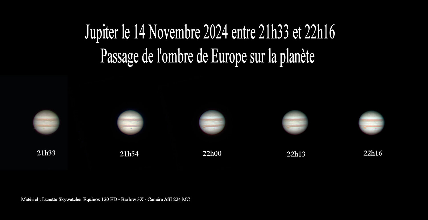 Bonjour, Jeudi dernier, le 14 Novembre, Le ciel était clair ( rare en ce moment !!!!!!!!!!!!!! ). Europe est passée devant Jupiter avec l'ombre du satellite et la Grande Tache Rouge Ci joint une planche avec quelques photos qui montrent le passage de l'ombre de Europe Bonne journée Lionel