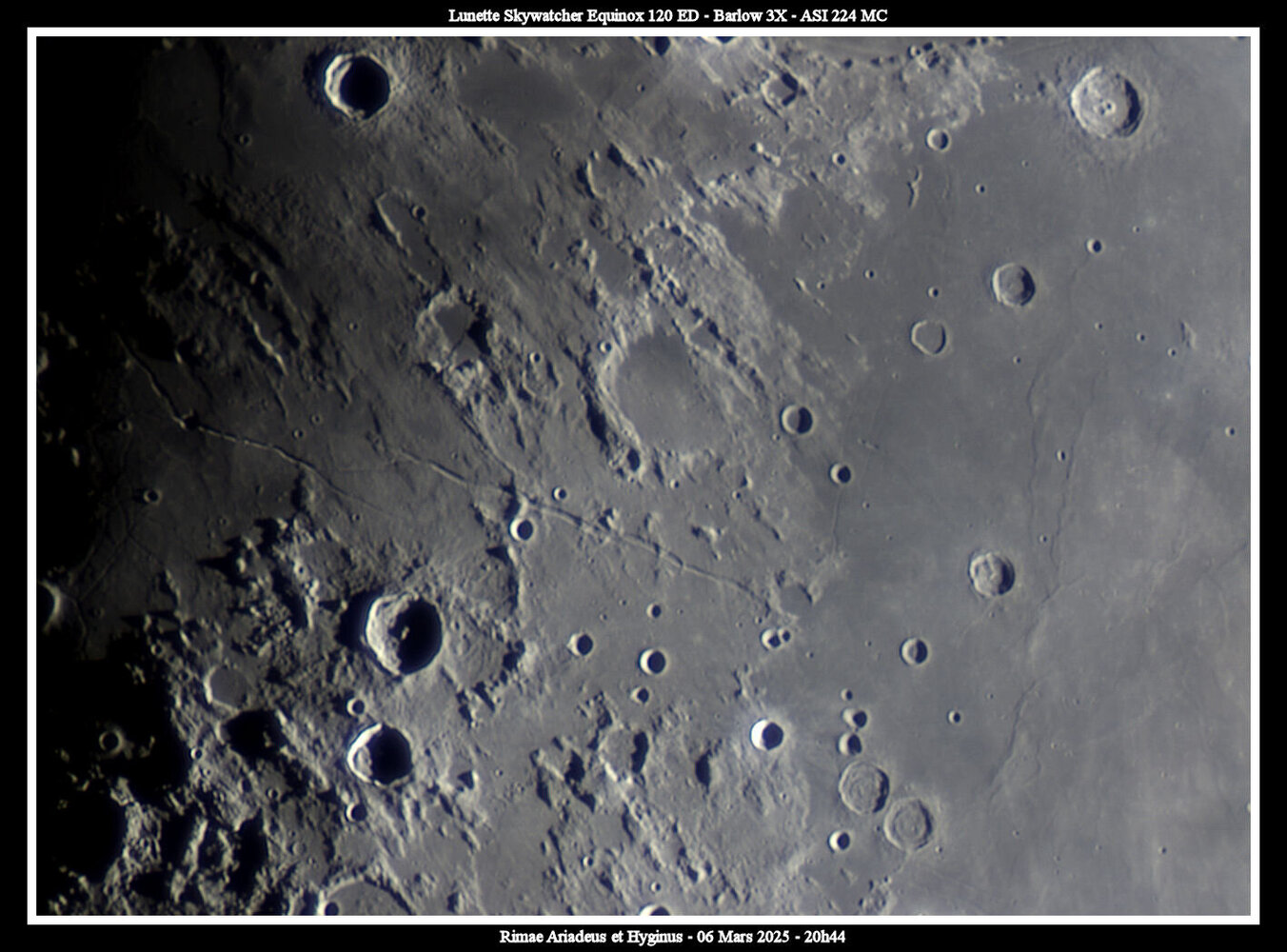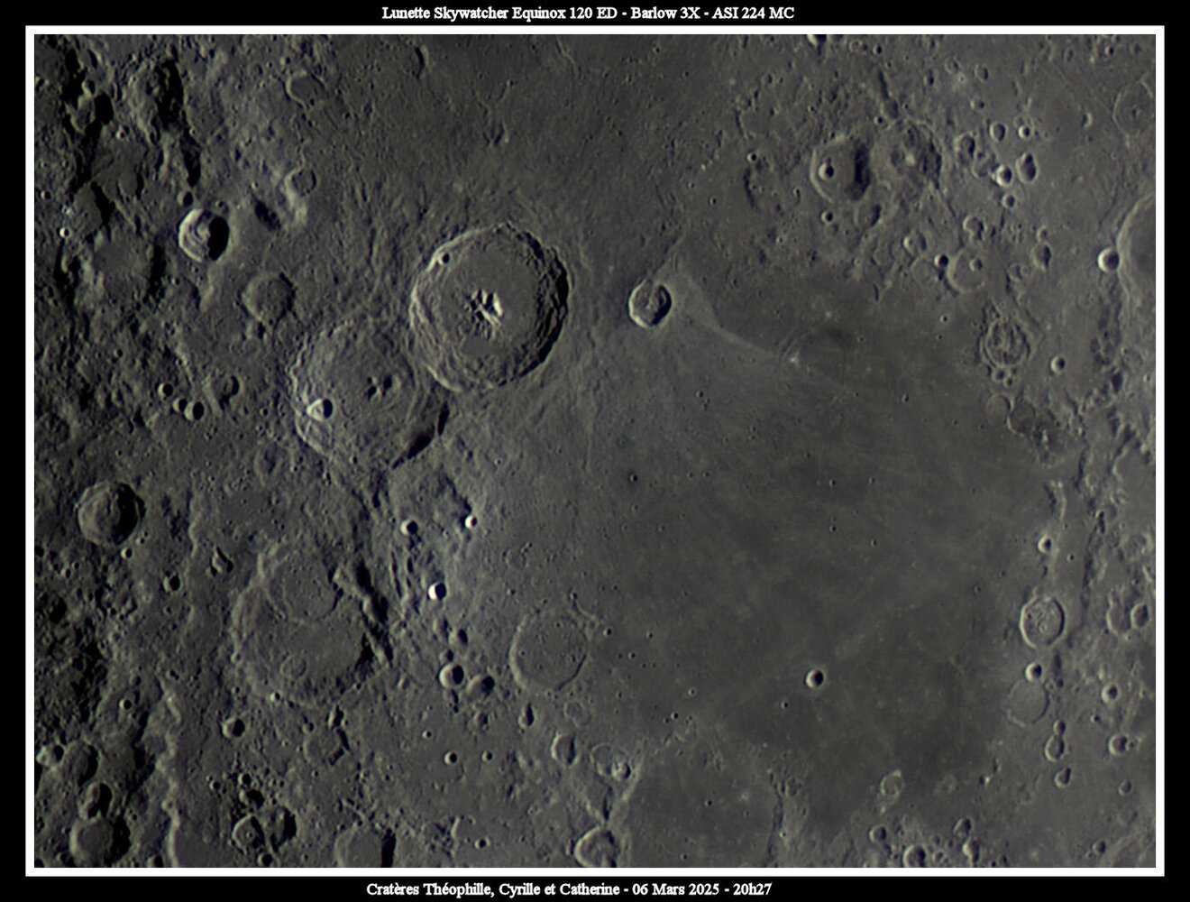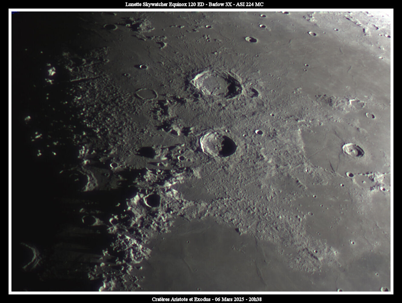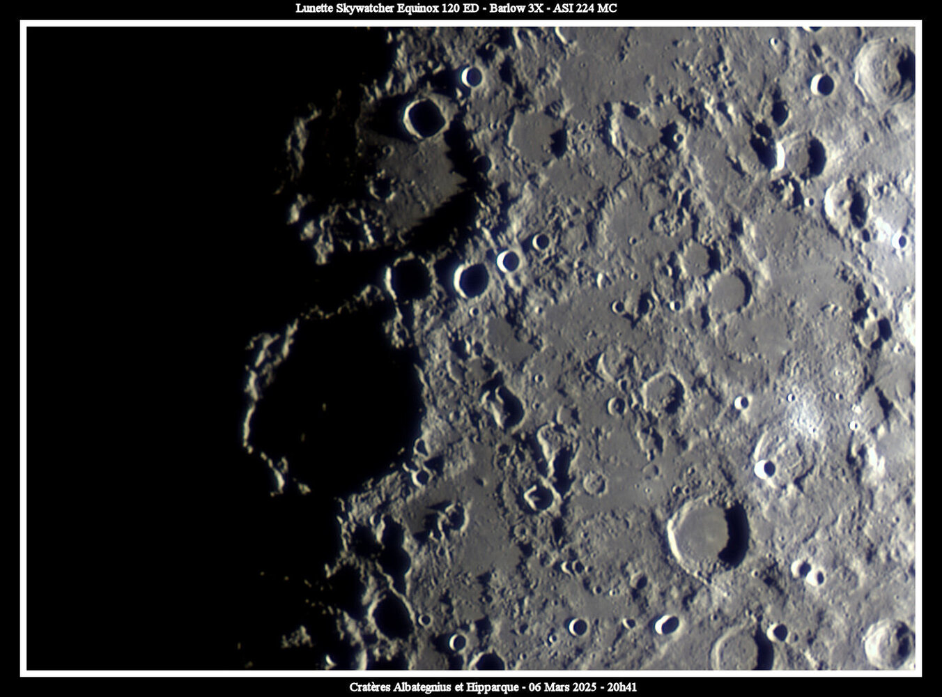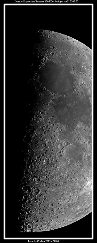 Bonjour, Le 06 Mars le ciel était bien clair ( pour une fois !!!!!!! ). J'ai voulu prendre Vénus car elle se présente sous un fin croissant . Il y avait pas mal de turbulence ( ca bougeait dur !!!!! ). Après quelques films je me suis tourné vers la Lune très haute dans le ciel pour faire quelques paysages lunaires ( ça faisait un moment que je n 'avais pas photographié la Lune ). matériel : lunette Skywatcher Equinox 120 ED sur monture HEQ 5 Pro GOTO, barlow 3x, caméra ASI 224 MC Traitement : Sharcap, Autostakkert Registax, Faststone Bonne journée Lionel