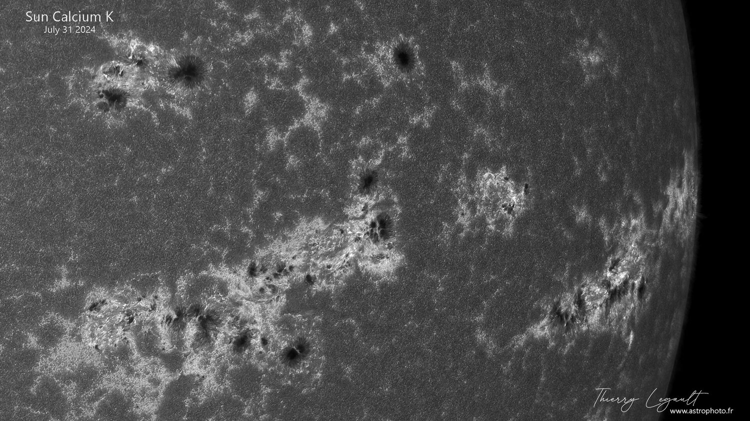 hello le soleil en CaK à 393 nm (proche UV) c'est passionnant, un bon complément au Halpha. La plupart des amateurs utilisent des filtres Lunt, mais nous sommes quelques-uns à utiliser des filtres Alluxa. Ces filtres font 25mm de diamètre (on peut donc facilement mettre n'importe quel capteur monochrome derrière) et ont une bande passante donnée pour 1 A. En fait après mesure ils font un peu plus que ça, mais ça reste environ deux fois plus étroit que les Lunt qui sont annoncés à 2,4 A. Et leur transmission est bien meilleure aussi. Il faut juste leur ajouter un équivalent de BF, par exemple un K-line Baader. Un exemple pris avec ma FSQ-106 (avec Baader K-line, Barlow et Alluxa) : Un autre avec une lunette Sky-Watcher de 150mm optimisée pour le Calcium (même montage) : Sans oublier les époustouflantes images de Christian Viladrich avec son Newton 300 mm spécial solaire et filtres Alluxa en double stack : http://www.astrosurf.com/topic/170661-1er-images-en-ca-k-1-a-double-stack-au-newton-de-300-mm-un-nouveau-monde-27-juillet/ Le filtre est normalement à 2314 dollars, ce qui fait dans les 2700 euros port et taxes comprises. Ca fait une somme comparable au prix d'un Lunt en 12 mm seulement donc plus petit, à bande plus large et à transmission moins élevée. https://alluxa.com/optical-filter-catalog/ultra-narrow-bandpass/393-37-0-1-od4-ultra-narrow-bandpass-filter/ Alluxa fait un rabais de 30% (!) lorsque ces filtres sont commandés par 10, ce qui fait descendre à 1900 euros environ, soit le prix d'un Lunt en 6 mm. Sur Solarchat, on arrive à 7 filtres (dont un pour moi, pour passer en double stack), donc il ne manque plus que 3 candidats ! Si vous êtes tenté n"hésitez pas, une telle occasion ne se représentera pas de sitôt 😄 (et je ne parle pas des droits de douane qui pourraient faire le yoyo, rapport à l'actualité brûlante 😏) -