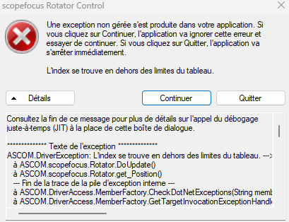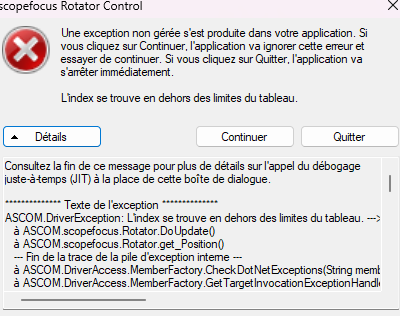Je viens de tester avec mon pc astro , sur lequel tous mes périphériques fonctionne et j'ai le même problème ascom renvoi une erreur " l'index se trouve en dehors des limites du tableau "