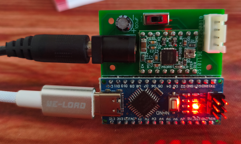 Une image du rotateur monté devant un spectromètre UVEX 4i avec un moteur Nema 17hd4005. Le capot est plus épais, j'ai monté le driver et la carte arduino sur des headers afin de pouvoir les remplacer facilement. Le câble du moteur passe de ce fait directement sous la carte arduino , ce qui évite la découpe sur le haut du boitier.