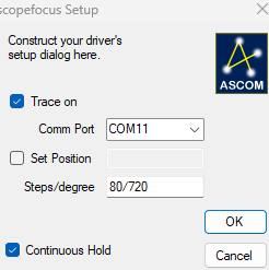 Oui , je me connecte bien avec le port com dédié , mais si je veux faire un cw par exemple , 'j'ai une erreur Dans le programme arduino , je dois mettre 20 à Gear ? ensuite suivant ton tableau , je calcule le nombre de step pour 720 degres , soit pour le 7HS08-1004S 64*720 = 46080 dans le driver ascom je dois saisir 64 ?