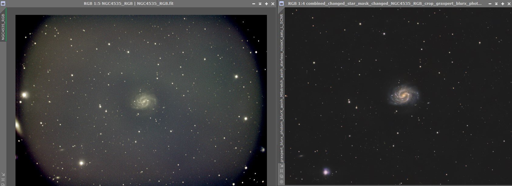 Alors dans l'ordre des actions: - BlurX en mode "Correct only" pour corriger les étoiles (pas grand chose à corriger, le C8 était bien réglé) - Image Analysis / Plate Solve - correction des couleurs avec SPCC (options par défaut) - retrait de gradient avec le module intégré de Pix: Gradient Correction en mode par défaut - BlurX de nouveau, avec étoiles à 0.05 et l'autre curseur à 0.7 - montée d'histogramme avec ArcsinH à 50 - Script EZSoft Stretch pour continuer à monter l'histogramme - Starnet2 pour séparer étoiles / galaxie (starless) - sur les étoiles seules: Histogramme Transformation un peu, suivi de Color Saturation - sur la starless: Range Selection pour isoler la galaxie et en faire un masque. - Application du masque sur la starless - augmentation de l'histogramme avec Curve Transformation pour faire ressortir les bras de la galaxie sans cramer le coeur - extraction de la couche L de l'image couleur - application de la couche L sur l'image couleur avec LRGB Combination en ne cochant que la L et en mettant Saturation à 0.40 - 3 passage successifs ça augmente la saturation de façon douce et homogène - un peu de Unsharpmask sur la L pour faire ressortir les détails, intégration à l'image couleur en mettant saturation à 0.50, ça ne va pas l'augmenter de nouveau - Réintégration des étoiles sur la starless avec Pixelmath - Saturation, courbe pour finaliser le tout - SCNR pour l'excès de vert - ACDNR en mode Chrominance pour le bruit couleur - image finale S'il te manque des outils ou des scripts n'hésite par à demander