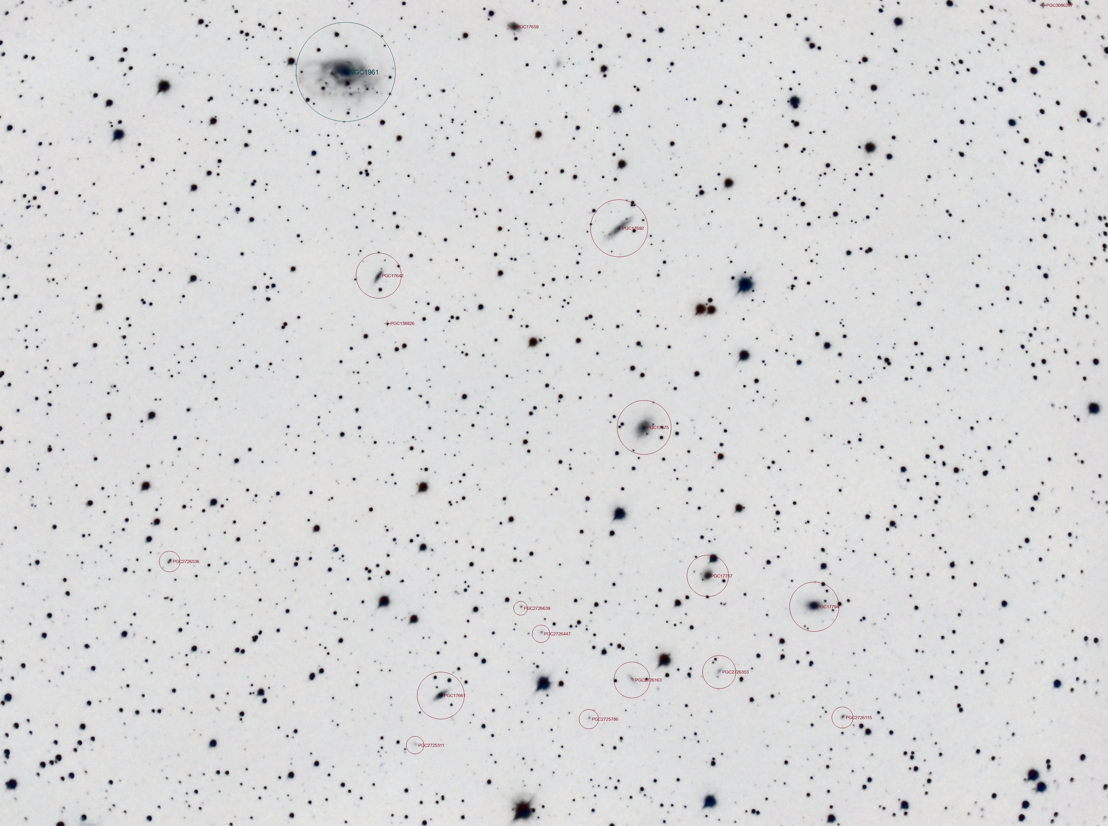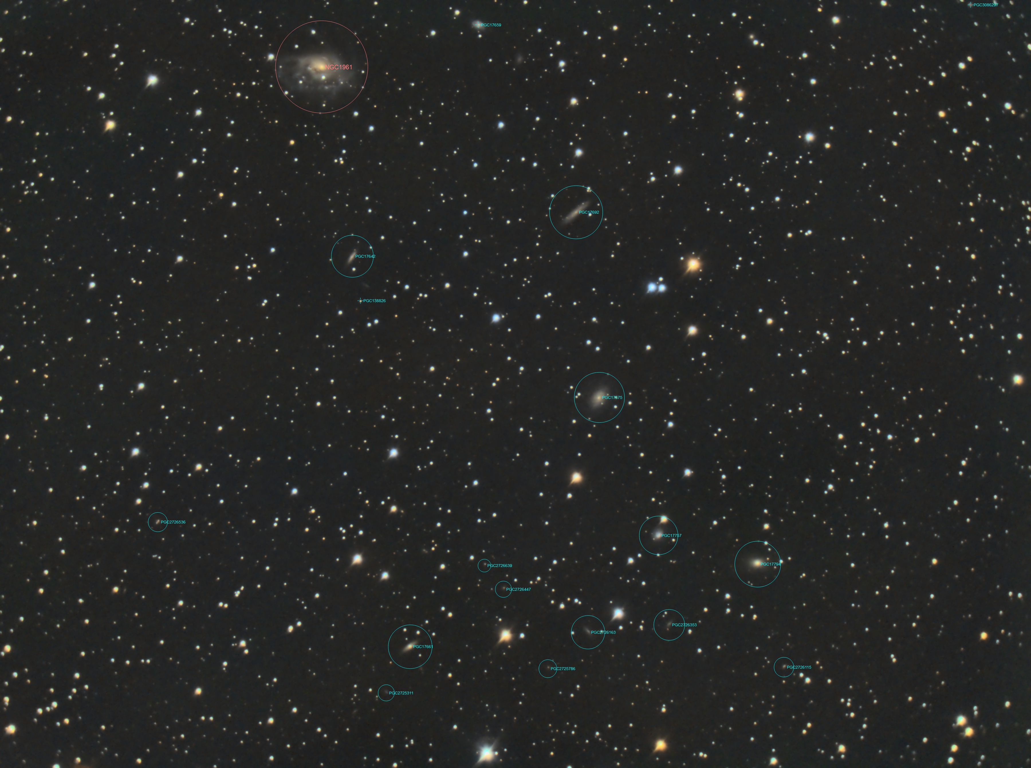 Bonsoir, Voici un champ avec pas mal de pétouilles dans la région de NGC1961 datant de Juillet dernier. NGC 1961 est une vaste galaxie spirale intermédiaire située dans la constellation de la Girafe. NGC 1961 présente une large raie HI. De plus, c'est une galaxie LINER, c'est-à-dire une galaxie dont le noyau présente un spectre d'émission caractérisé par de larges raies d'atomes faiblement ionisés. NGC 1961 est aussi une galaxie lumineuse dans l'infrarouge (LIRG). La galaxie NGC 1961 est la plus grosse et la plus brillante d'un groupe de galaxies d'au moins 6 membres qui porte son nom. Les 5 autres galaxies du groupe de NGC 1961 sont UGC 3319, UGC 3342, UGC 3379, CGCG 329-010 et MCG 12-6-13 (CGCG 3349). Les infos: Celestron C8 (203x2000) + réducteur Meade f6.3 (focale 1150mm f/d réel 5.7) Asi294mc pro + filtre IRcut. monture HEQ5 Rowan autoguidage lunette 70x400, Asi290mm / PHD2 acquisition NINA 66 x 120s Gain 120 -10°C Traitement Sirilic, Siril, Pixinsight, PS.