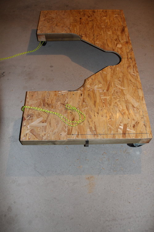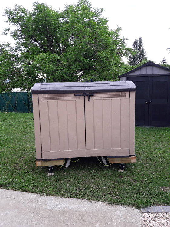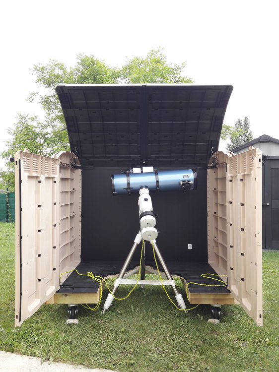 1. Bonsoir la communauté ! Voilà... l'envie de réaliser un abri roulant pour mon newton 200/1000 (monté sur NEQ6 pour de l'astrohoto) me trottait en tête depuis quelques mois et ces dernières semaines ont vu aboutir le choix définitif : un coffre de jardin toutenplastik fixé sur une base équipée de roulettes pour permettre de le déplacer facilement et rapidement sur l'herbe. Le trépied reposant alors sur l'herbe (voir plus tard pour maçonner des petites bases dessous). Le choix du coffre VS un abri de jardin s'est fait sur plusieurs critères : - une prise au vent moins importante et un centre de gravité plus bas, limitant les risques de cacatastrophe en cas de fortes bourrasques, tempêtes... - un déplacement plus facile sur roulettes du fait d'un poids plus faible (et je ne souhaitais pas réaliser de travaux dans mon jardin qui n'est déjà pas immense, de style "fondations pour y fixer des rails sur lesquels auraient pu rouler des petites poulies") - on oublie pas au passage de prendre l'avis de madame qui compte aussi (le patron est aussi parfois un peu une patronne 😉 ) : le coffre est plus discret qu'un abri de jardin (surtout quand il se retrouve en plein milieu du terrain, recouvrant le matériel) Avant de me lancer dans les recherches, j'ai pris les mesures de l'encombrement du matériel (lunette guide 80/400, télescope 200/1000, EOS 350D, monture,NEQ6, trépied, le tout assemblé bien entendu). Les points clés : - la hauteur : 150 cm : pour valider que, une fois fermé, je ne vienne pas écraser le matos - la profondeur à prendre entre l'aplomb de la butée de contre-poids et l'aplomb de la lunette guide : pour valider que cela passe entre la porte du coffre et le fond vertical - la profondeur mesurée sur le plan intersection du trépied à la hauteur donnée par la position future du plancher OSB (face inférieure) sur lequel repose le plancher de la cabane : pour définir s'il va rester assez de matière au niveau du plancher du coffre une fois découpée (garder de la rigidité). - pour la largeur : longueur du tube (un peu plus de 1 m) Après cela, je me suis lancé dans les recherches et suis tombé sur le coffre "store it out XL" de 2000L de volume (dimensions intérieures : largeur 164 x profondeur 97 x hauteur 127 cm). A partir de ses dimensions, j'en ai déduit qu'il me fallait avoir une hauteur roulettes+poutres+plancher d'environ 30 cm pour garantir suffisamment d'espace entre le bord des découpes du plancher OSB autour du trépied et également avoir une hauteur > 150cm. Choix des matériaux : - 2 roulettes diamètre 160mm fixes, hauteur totale : 200mm - 2 roulettes diamètres 160 mm pivotante, hauteur totale : 200mm - 2 planches OSB3 (adaptée aux milieux humides, mais il faut tout de même prévoir une lasure) de 205x67cm 18 mm épaisseur - 3 poteaux en bois traités classe 3 (contact ponctuel avec l'eau, qu'il faut prévoir de lasurer aussi) 2400mmx90x90 mm - 8 équerres pour raccorder les morceaux de poteaux - 1 corde à couper en 2 pour piloter l'engin lorsqu'on veut recouvrir le matériel. On peut ainsi voir l'espace restant autour des pieds et on évite de mettre en vrac la mise en station - des tubes carrés à planter dans le sol ainsi que des tubes ronds qui réalisent la liaison entre le coffre et le sol par insertion dans les carrés, afin d'immobiliser la bête... - de la lasure pour le bois, de la bombe de peinture pour les tubes... - les vis qui vont bien Soit un budget global de 585€. J'ai donc dessiné sur PowerPoint (non, ne rigolez pas) le concept de la base. J'ai partagé cela avec mon papa et en 1 week-end nous avons réalisé les découpes et assemblages : - découpe des morceaux de poteaux : scie à onglet et huile de coude (oui, avec une scie à onglet électrique, c'eut été plus rapide, mais je n'en ai pas... et il en faut une qui accepte une hauteur > 90mm) - assemblage des morceaux entre eux grâce aux équerres - fixation des roulettes (les pivotantes étant coté matériel afin de faciliter le "créneau" lors de l'approche avant couverture) et premier test de déplacement consistant en la chose suivante : mon papa tirait les 2 cordes alors que j'étais étendu "en araignée" sur la structure afin de voir si le déplacement futur allait être laborieux (mon poids représentant peu ou prou celui du coffre). Conclusion : ça se manipule facilement malgré un roulage sur de l'herbe et un terrain pas forcément très régulier 🙂 - découpe des planches OSB à la scie sauteuse (vive le monde moderne) en prenant soin de réaliser la zone dans laquelle vient "s'insérer" le trépied au plus juste tout en laissant un peu de place autour pour éviter de percuter le pied lors des manœuvres - fixation des planches OSB sur la structure poteaux, permettant alors une rigidification de l'ensemble - fixation du plancher du coffre à l'aide de 4 tire-fonds traversant l'OSB (penser à faire des pré-trous) et vissés dans les poteaux (ça ne bougera pas...) - assemblage du coffre en faisant attention de ne pas y aller comme un bourrin pour le serrage des diverses vis, ici on visse dans du plastique, plus dans du bois... - réalisation de pièce à partir du tube carré (idée de génie de mon papa...) : 1 de chaque coté, visée dans la structure poteaux. Ces pièces permettent de "verrouiller" la position du coffre et éviter ainsi les basculements et déplacement causés par le vent - réalisation des piquets tube carrés ainsi que des "tiges-verrous". Ici mon papa a joué les ferronniers 🙂 Jusqu'à maintenant j'avais calé avec des pierres, ça a tenu mais c'est peu durable. - validation du concept : l'ensemble se déplace bien, reste rigide et sa manipule assez facilement, évitant les chocs avec le trépied notamment. Il tient bien la pluie également puisque aucune goutte n'a été vue dans le coffre lors de la forte pluie de début de semaine. De l'eau par contre arrive à stagner sur la planche OSB => il est urgent