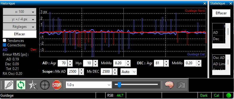 Bonjour Il était dit que cette mise à jour améliorerait le suivi , mais à ce point ...??? Les conditions d'utilisation le 05-08-2025: milieu urbain ; vent léger ; lune mise en station pole master; durée des poses 300 secondes ,suivi PHD2 paramètres inchangés Le matériel : Monture Losmandy G11 age 23 ans, équipée d'une vis sans fin de précision Losmandy montée'dans une cage à roulements Ovision. Lunette Esprit 120 focale 840 + lunette de suivi 66/400 poids de l'équipement 16 à 18 kilos.voilà le résultat